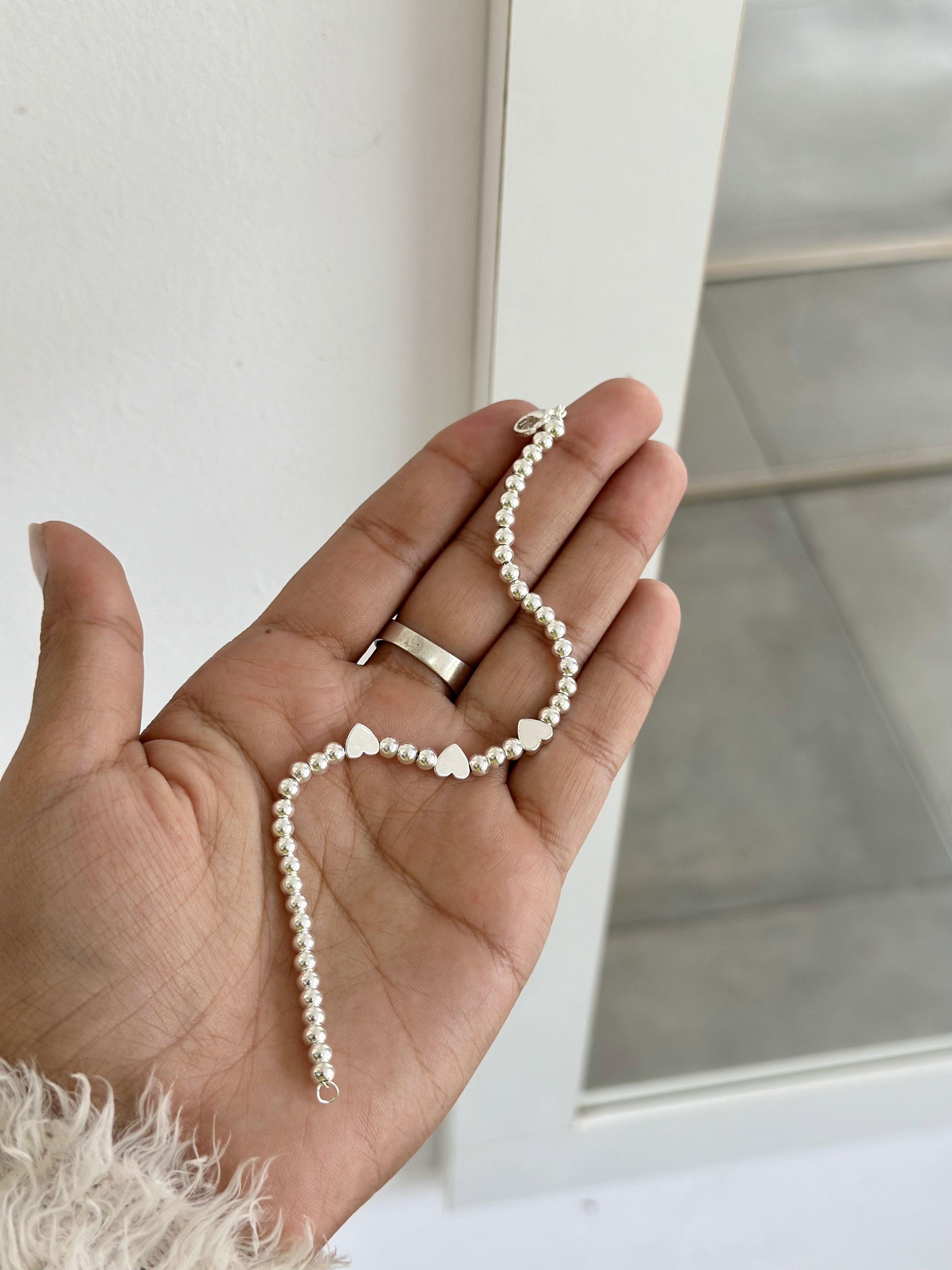 Pulsera bolitas con corazón acero blanco, 18cm.