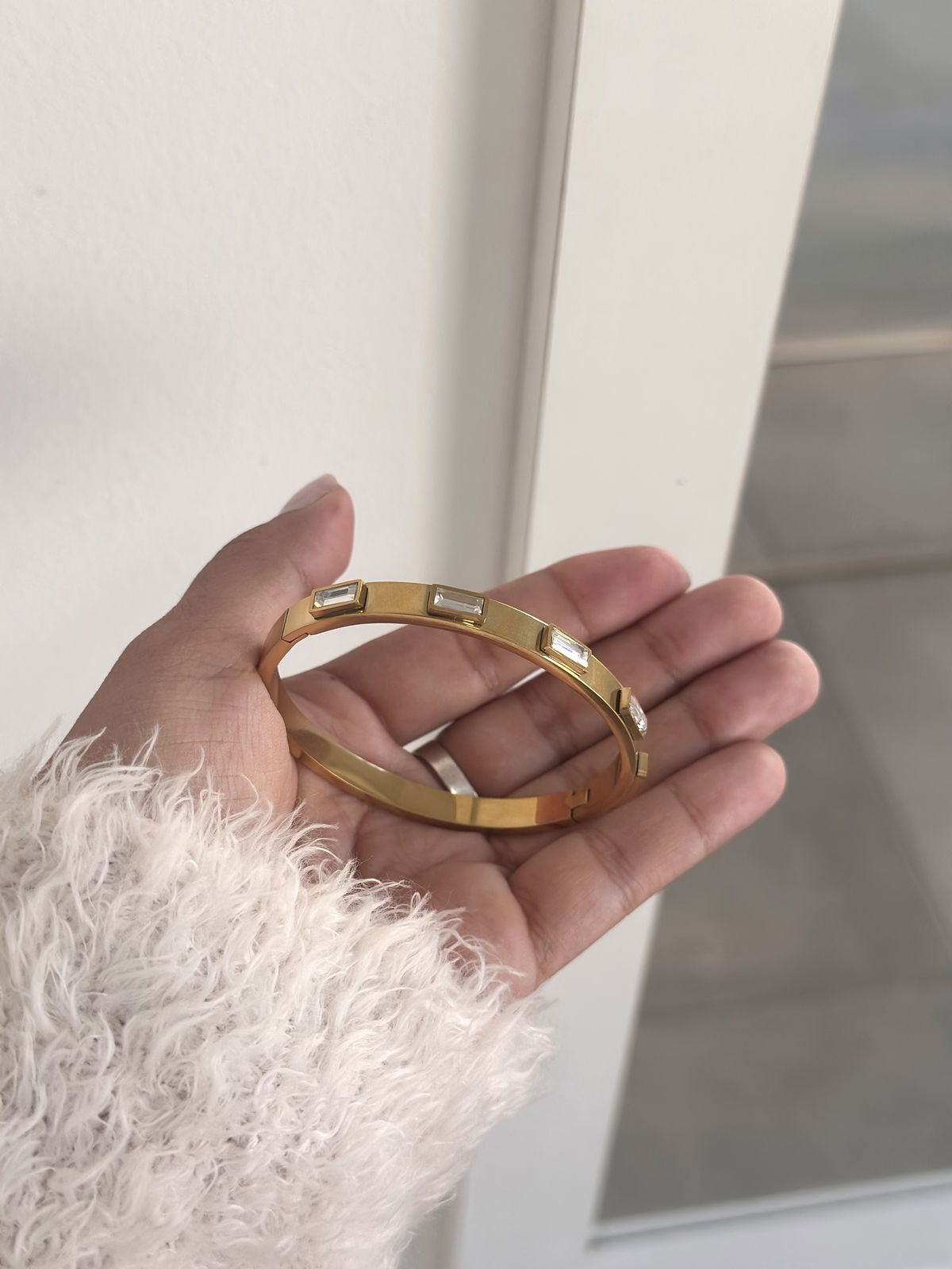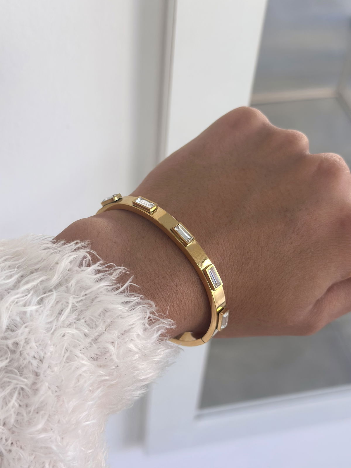 Esclava ancha con cubics cuadrados, 6 cm de diámetro acero dorado.
