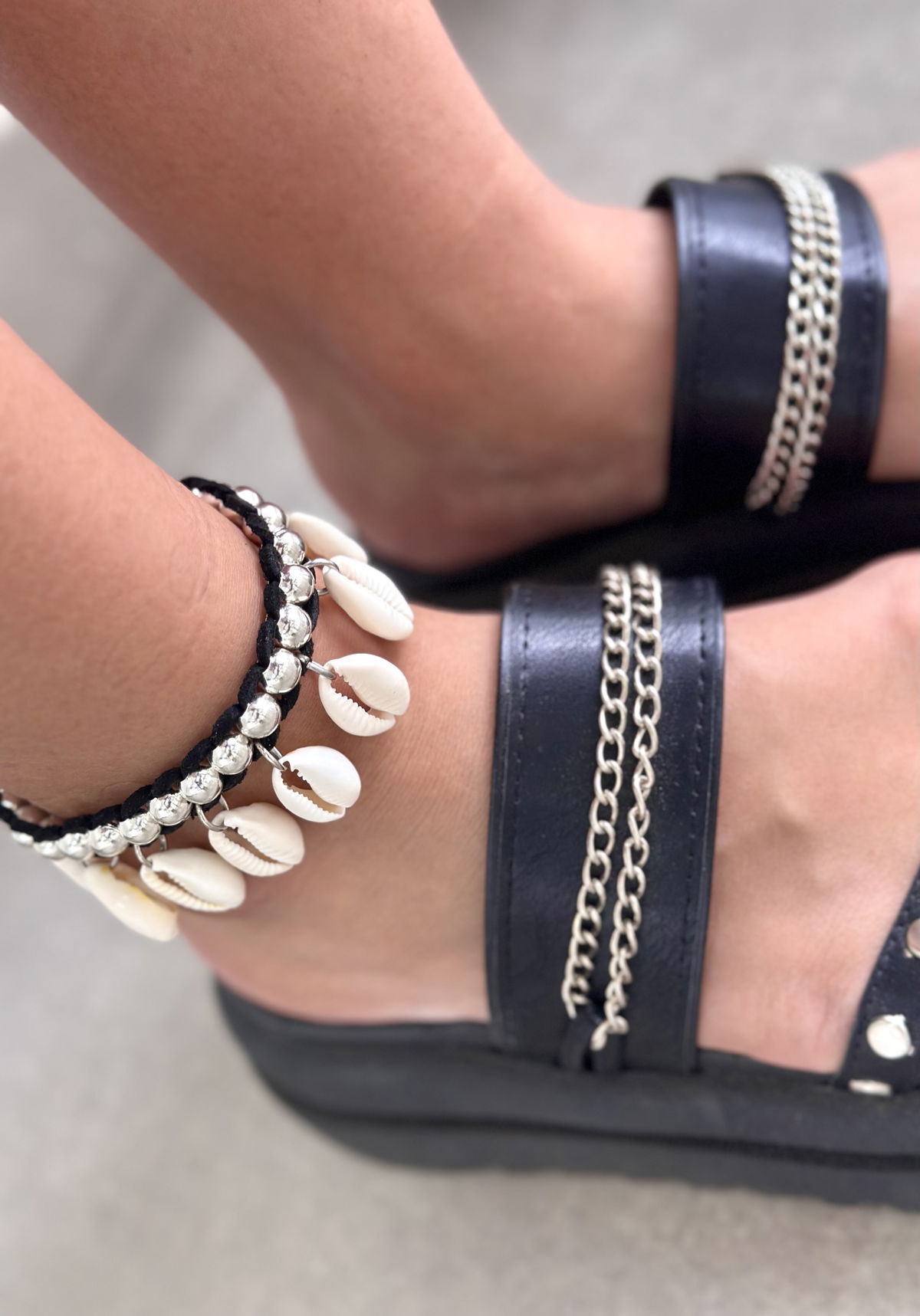 Tobillera caracoles con hilo gamuzado y bolitas de metal.