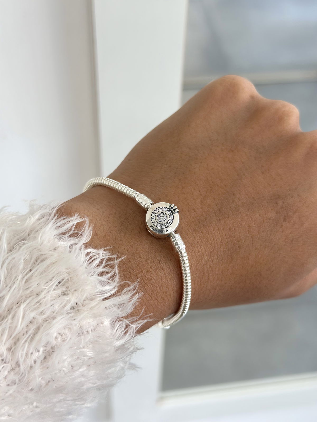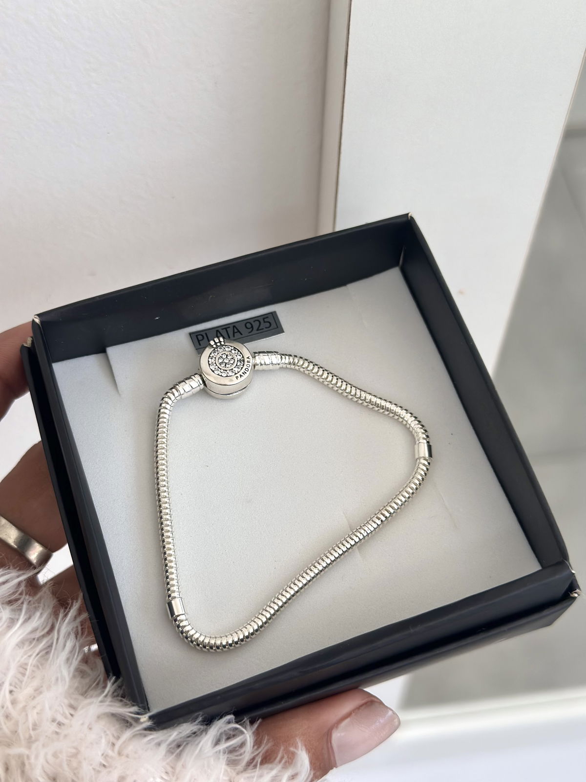 Pulsera Pandora flexible, cierre doble lado brillo plata925.