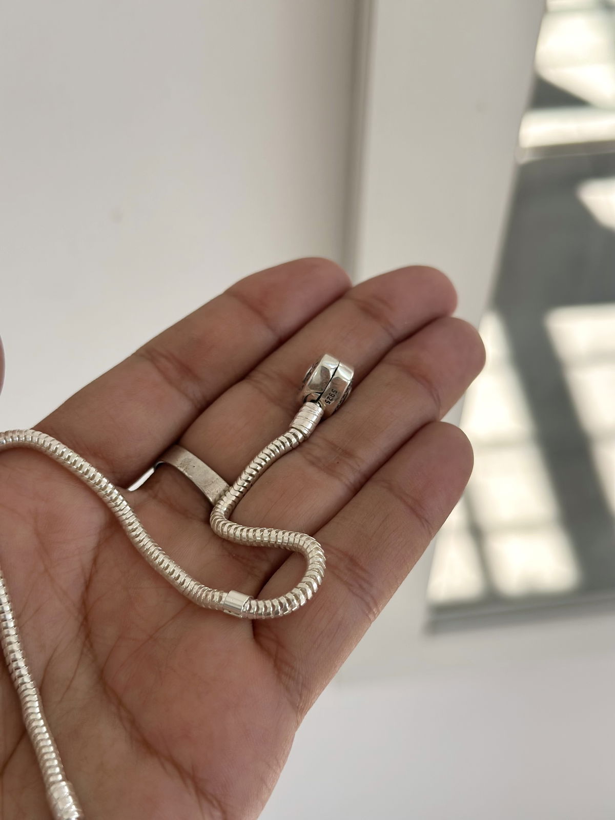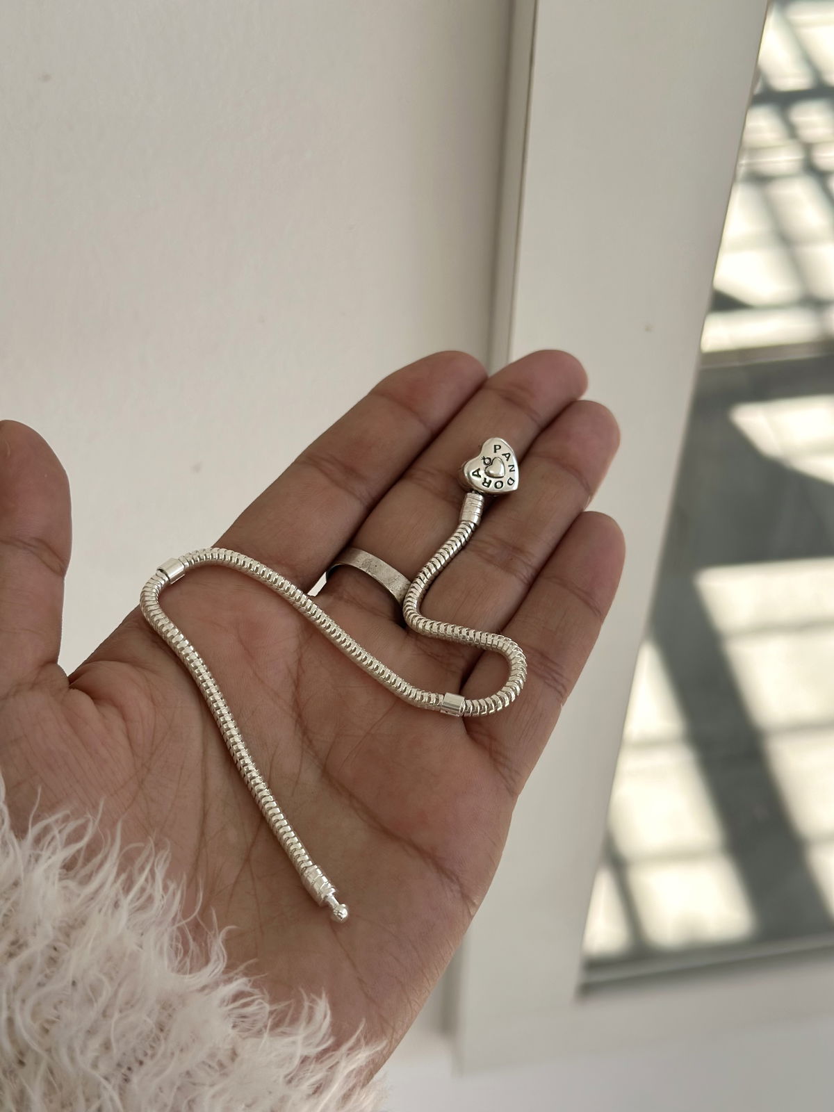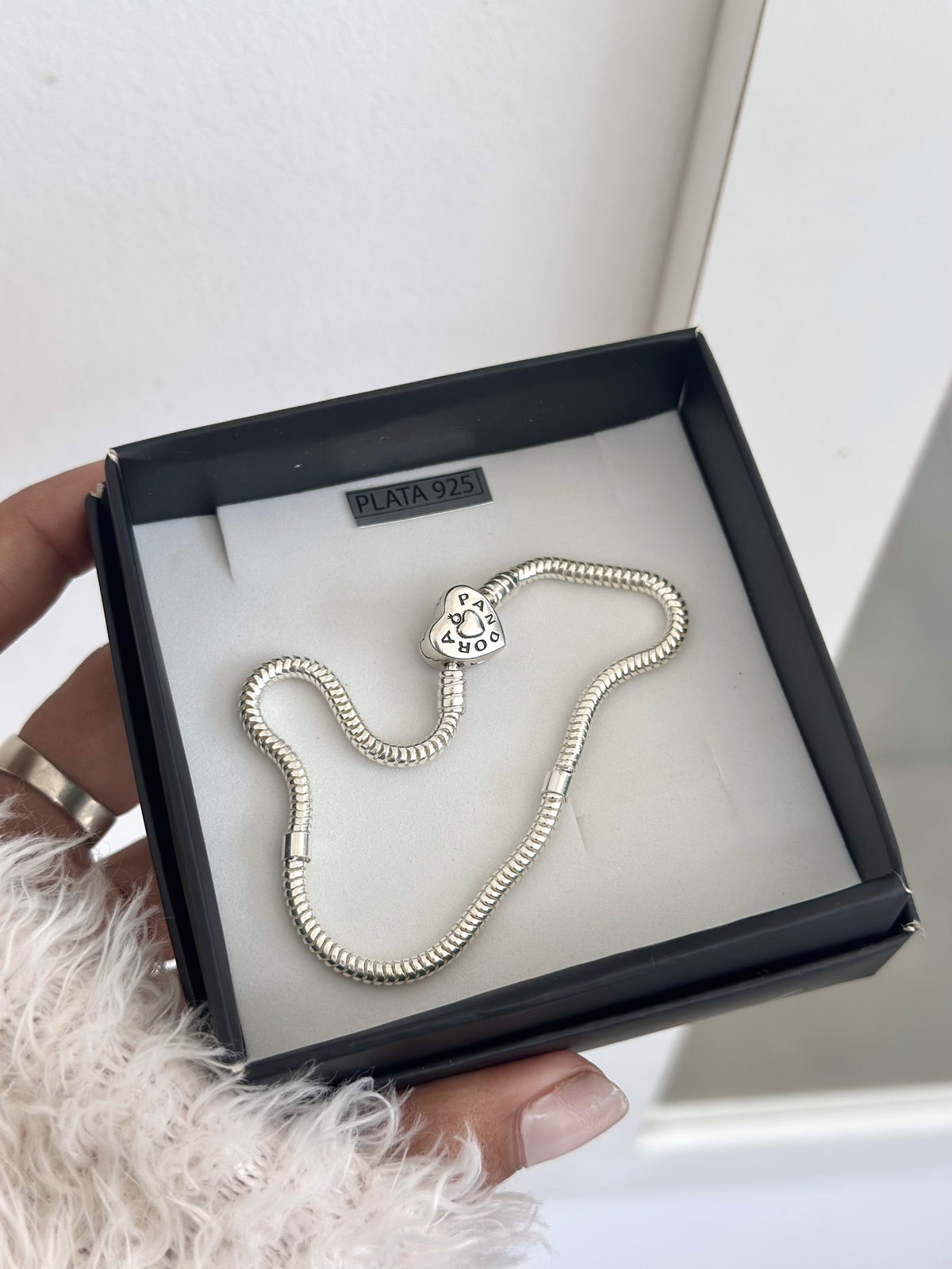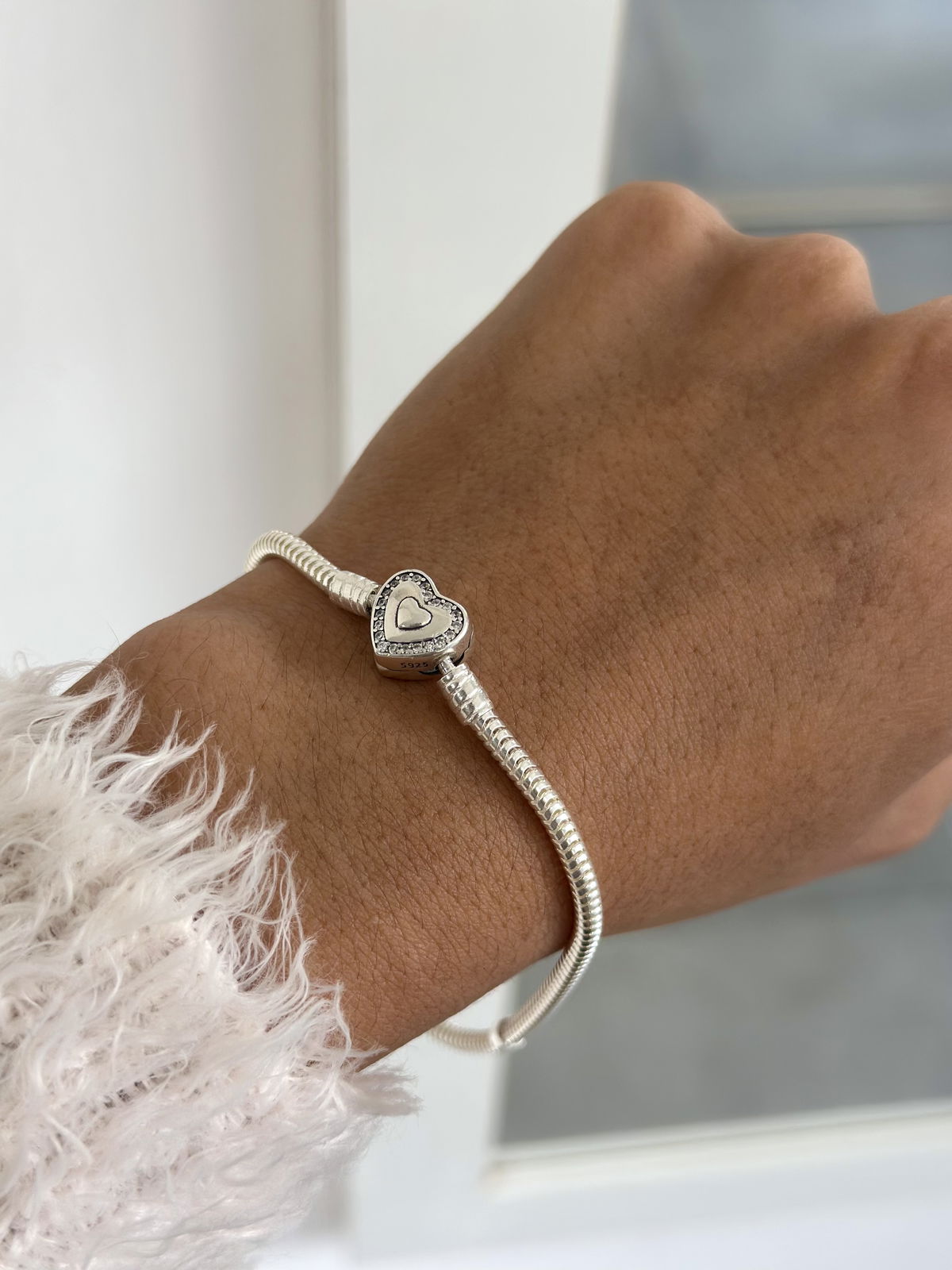 Pulsera pandora flexible, con cierre corazón lado liso y lado brillante.