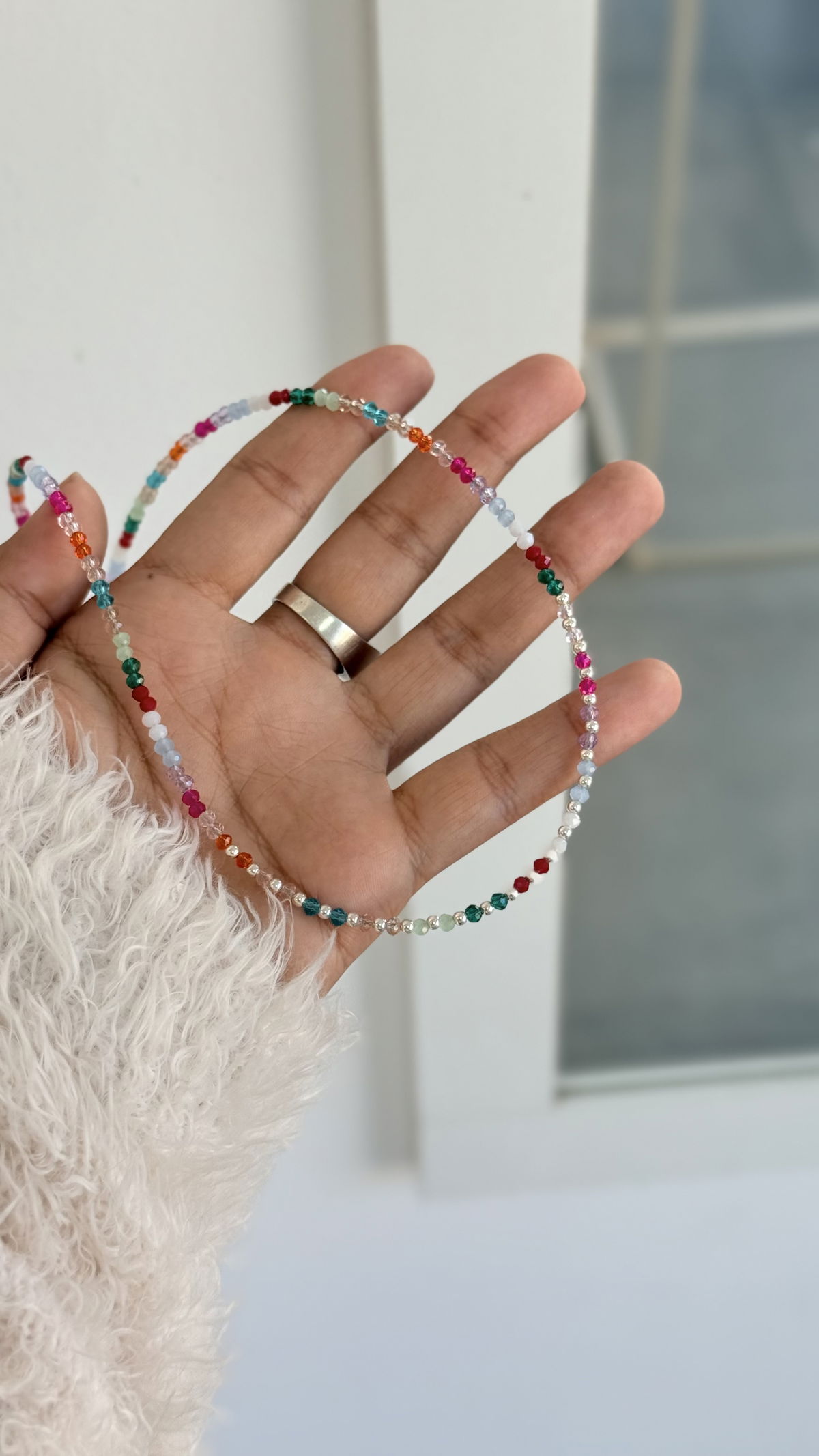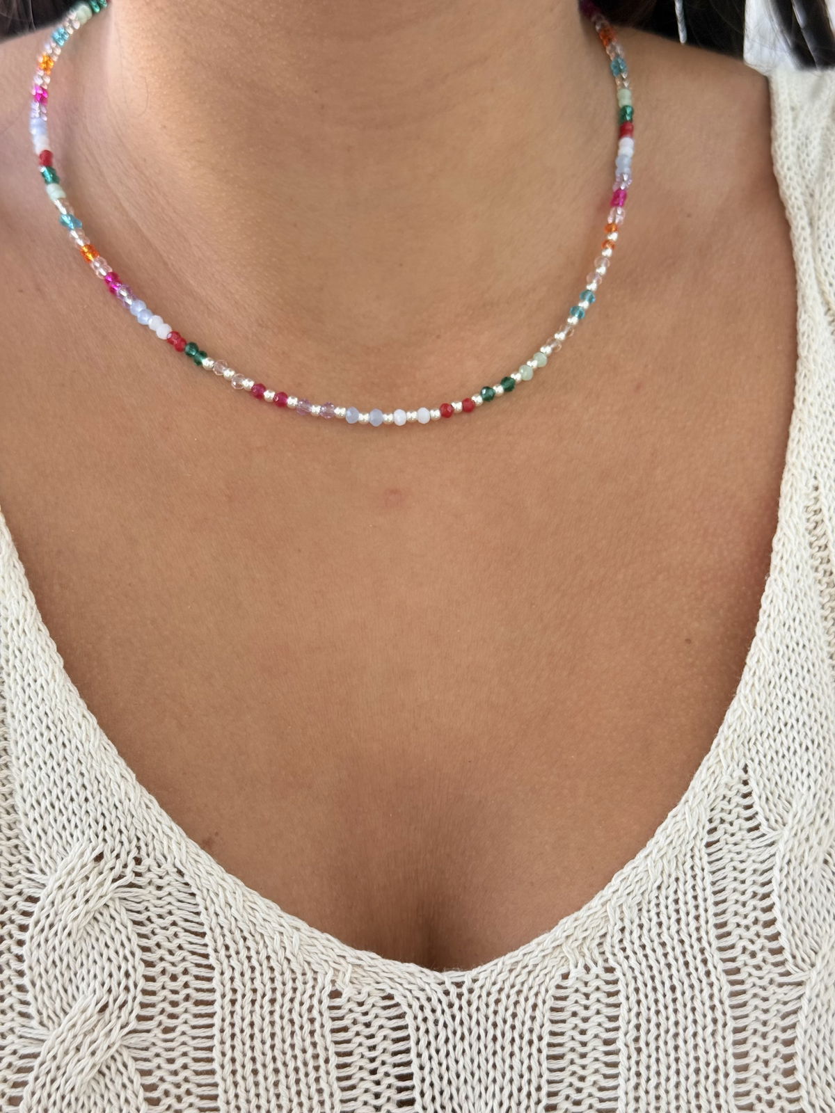 Gargantilla cristales de colores y bolitas de plata, 43cm.