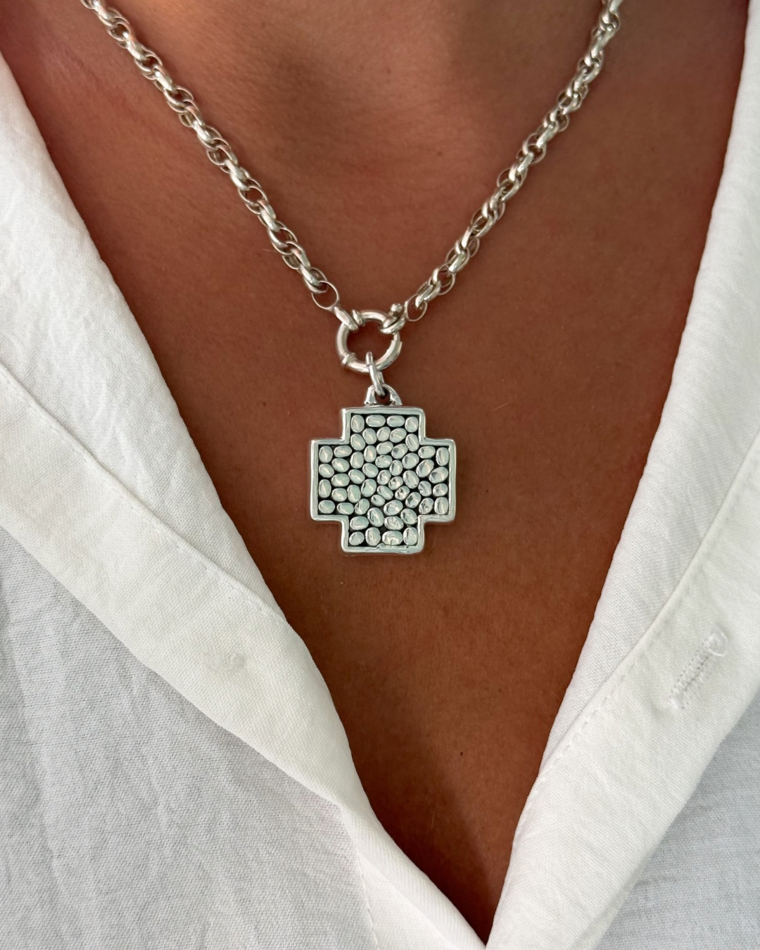 Conjunto cadena turbillon con cierre marinero y dije plata inflada.