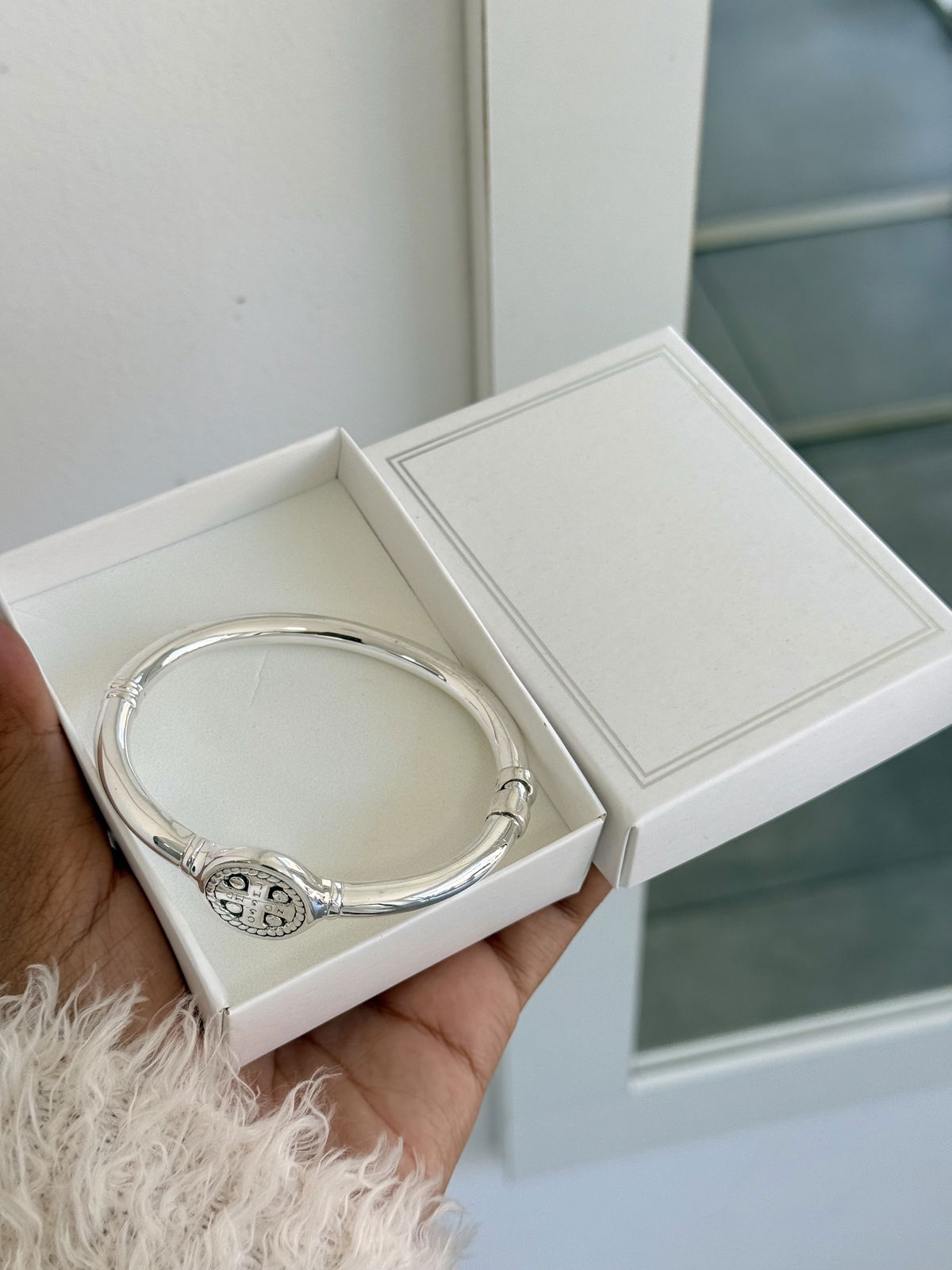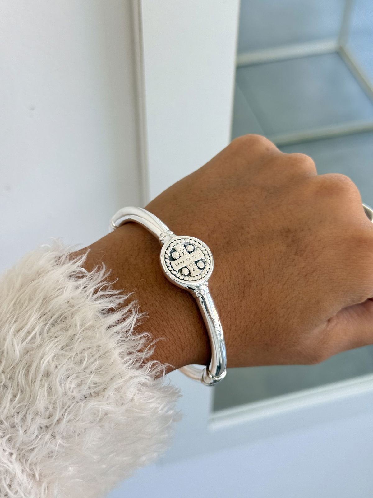 Esclava cierre tipo pinza, sello san Benito, 5,8cm de diámetro plata inflada.
