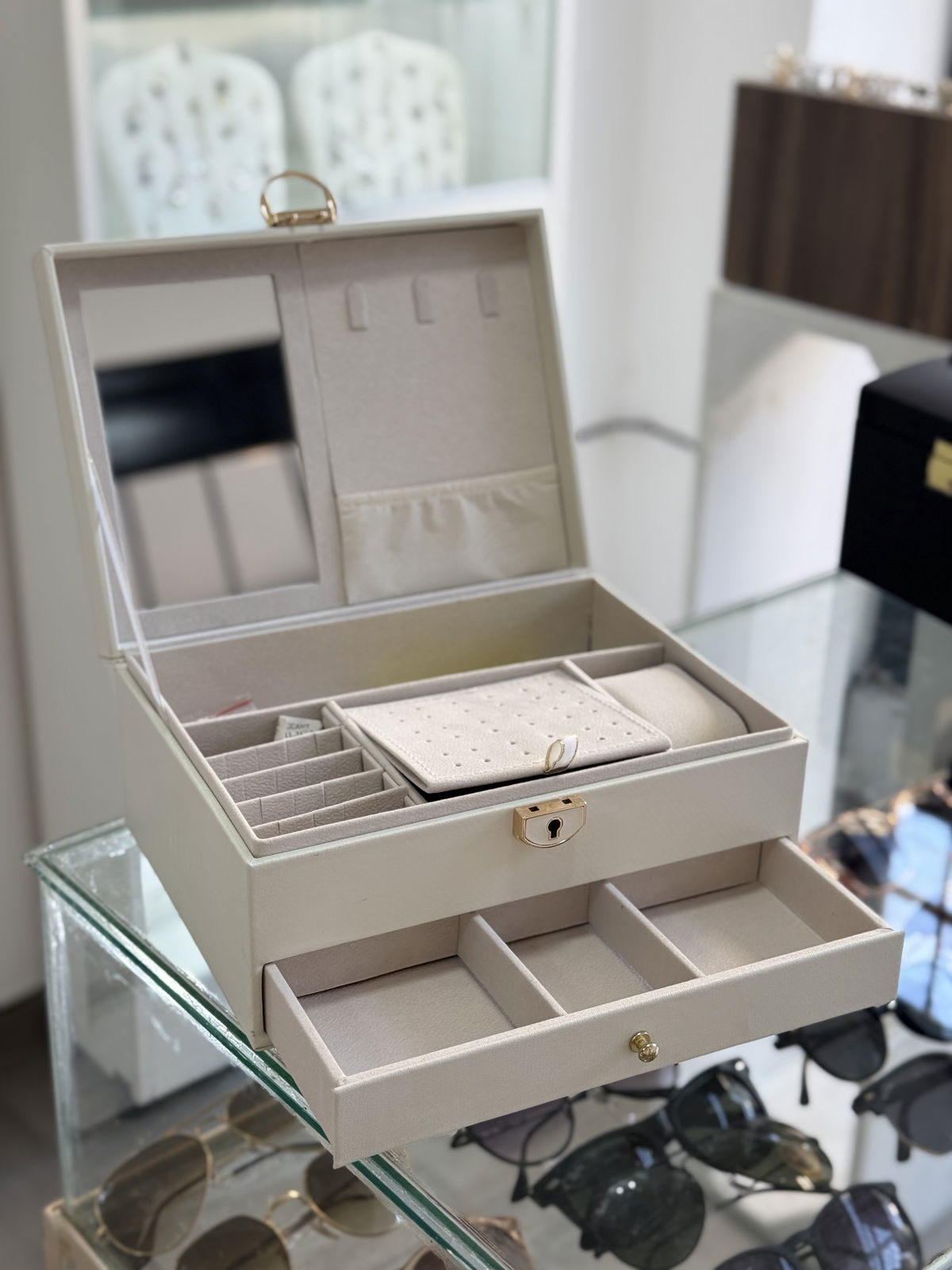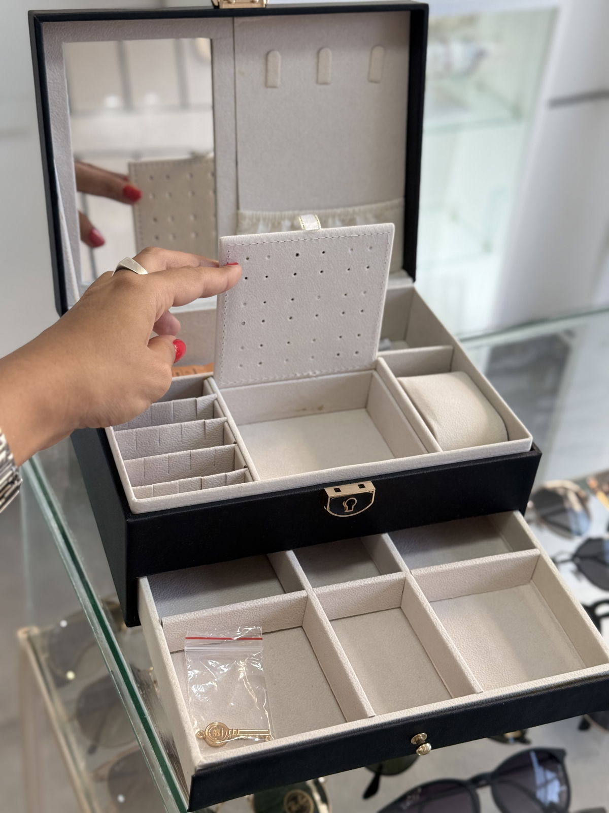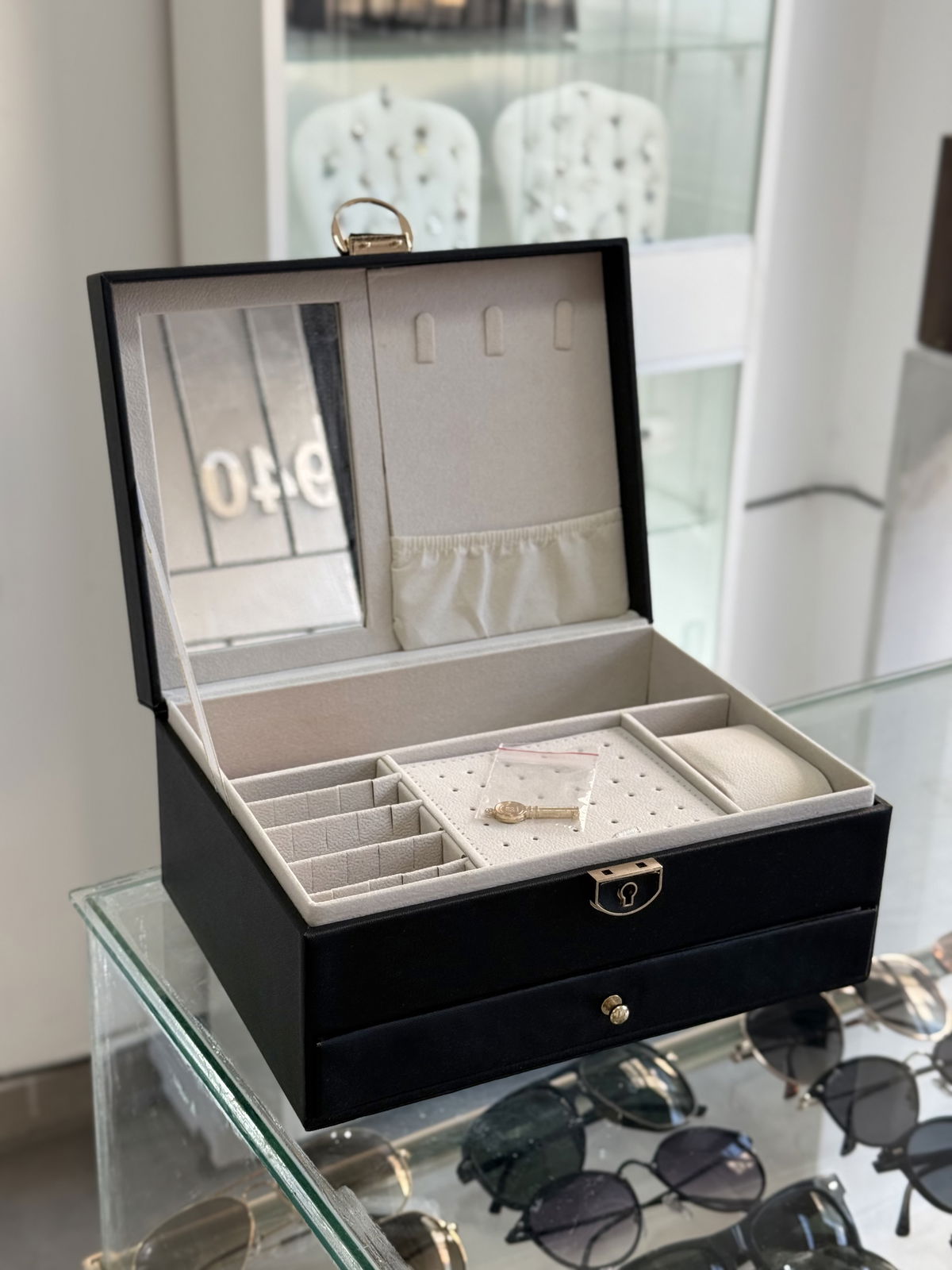 Alhajero cuerina con llave, 23x17x10 con cajon inferior.