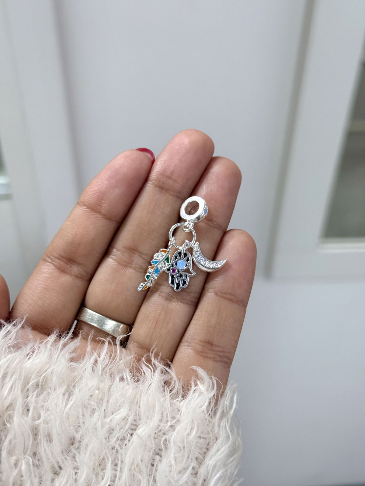 Charms triple dije hojitas, mano de Fátima y luna esmaltada plata925.