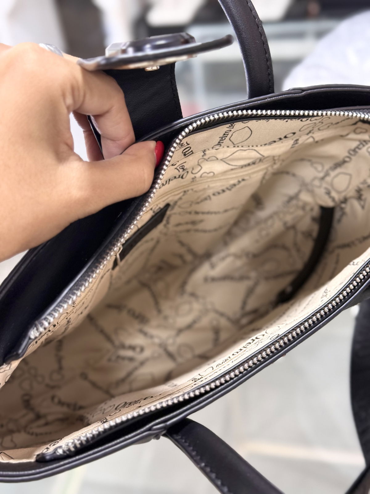 Cartera con correa, 22 cm de alto, 23cm de ancho, 11cm de profundidad, interior forrado con bolsillos, bolsillo delantero, las oreiro.