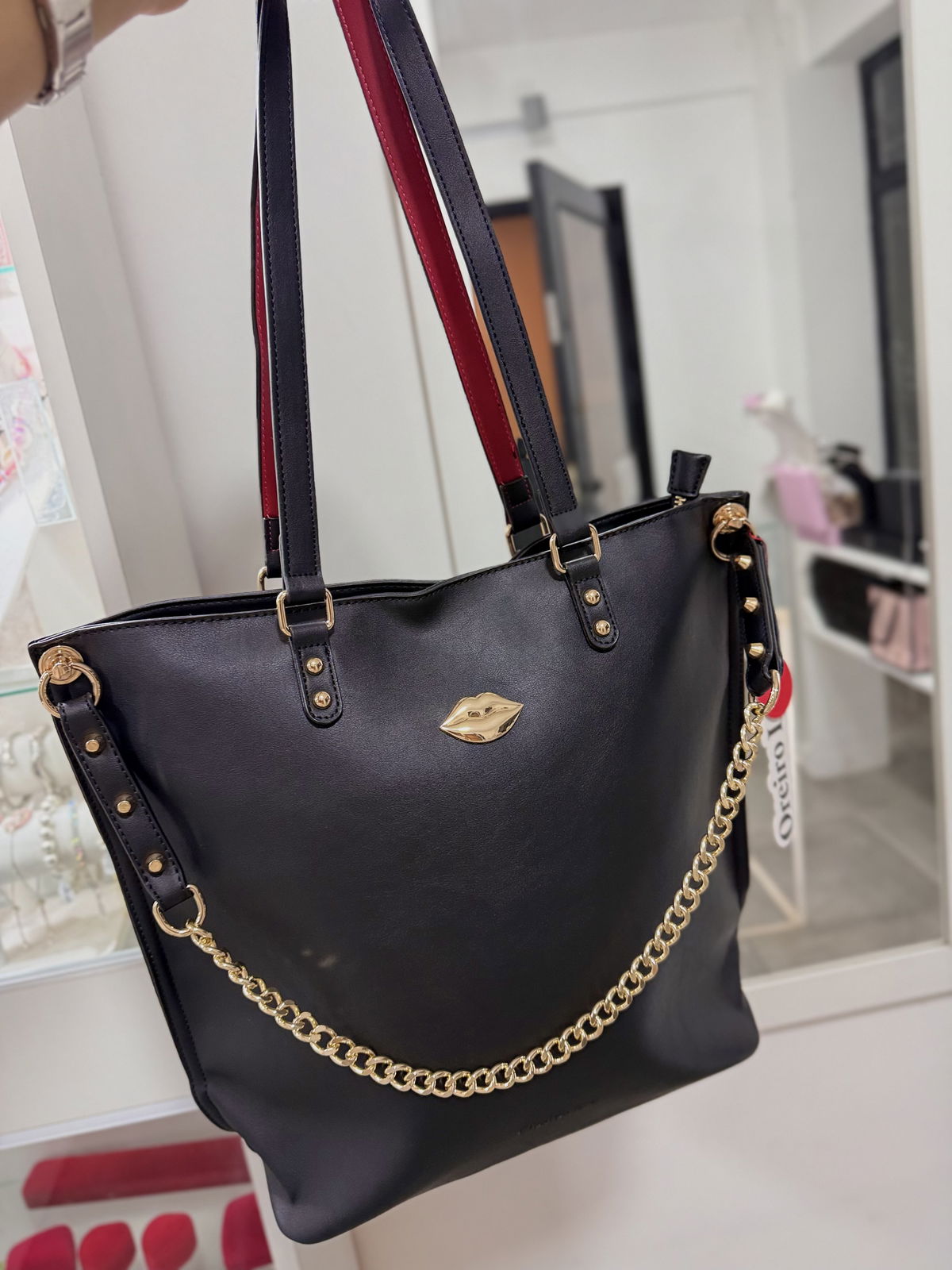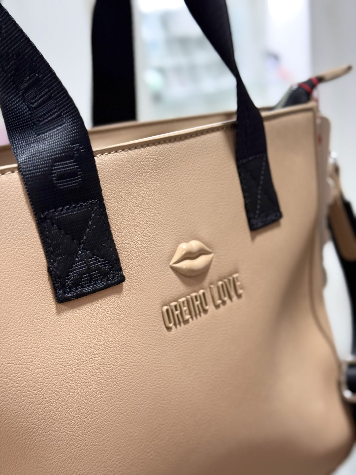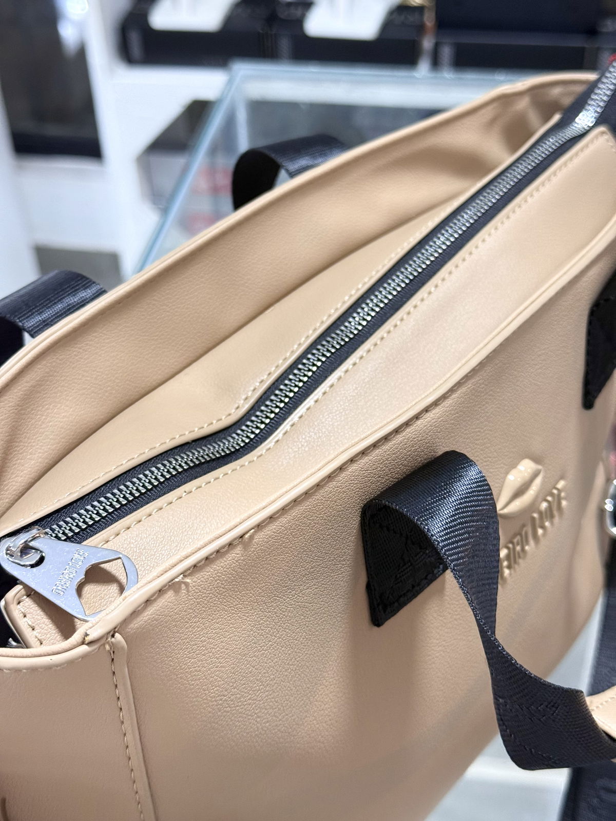 Bolso correa y manija, con cierre, interior forrado con bolsillos, 24 cm de alto, 29cm de ancho, 11 de profundidad.