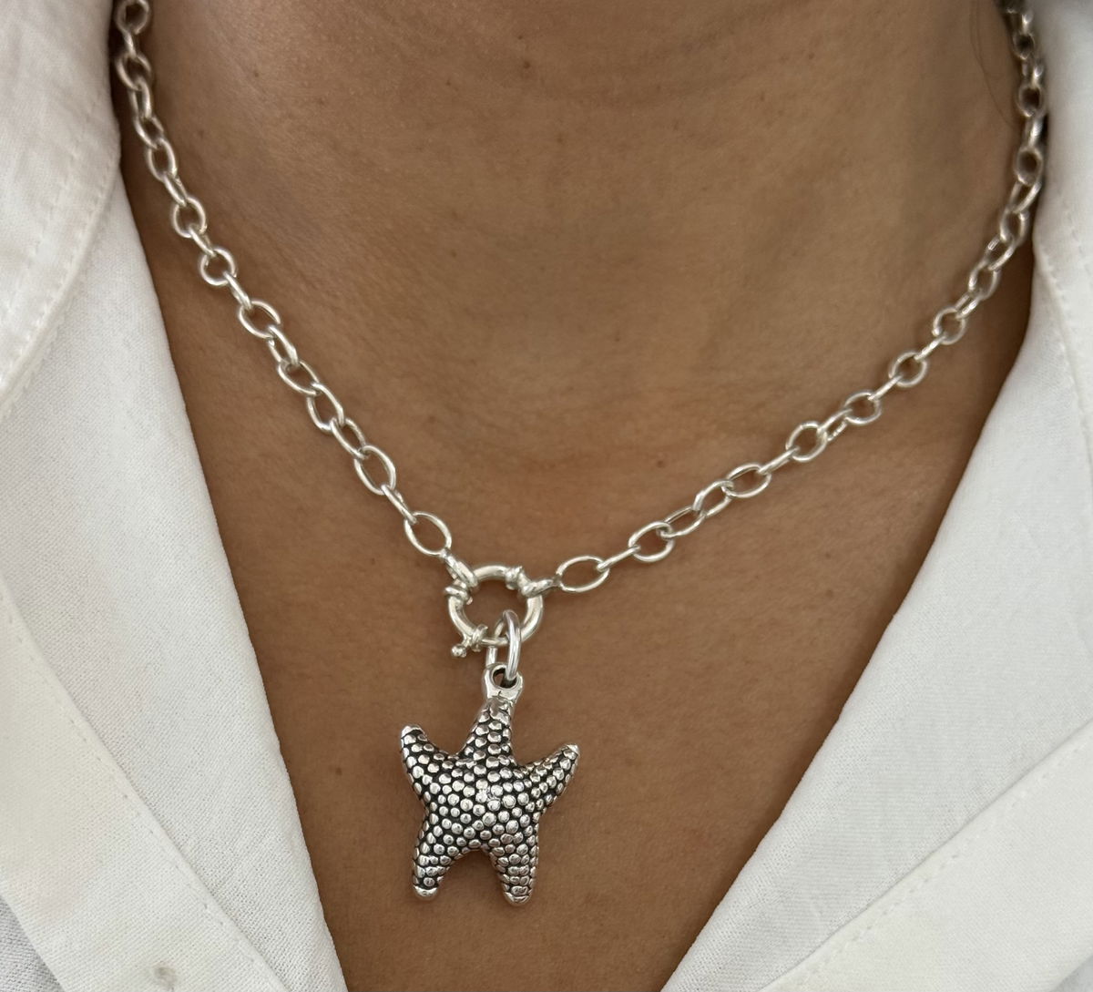 Conjunto cadena con cierre marinero y dije plata inflada.