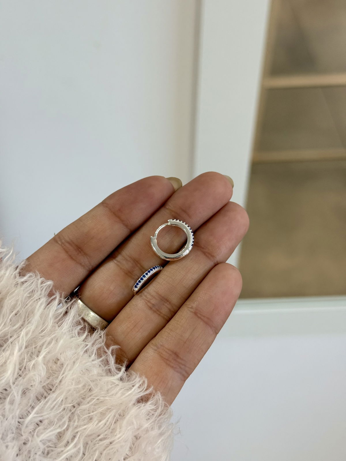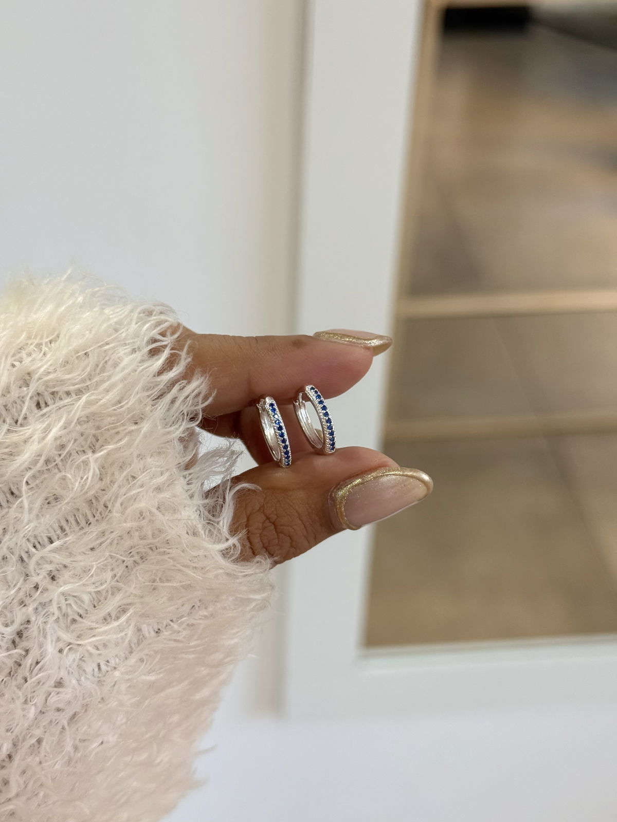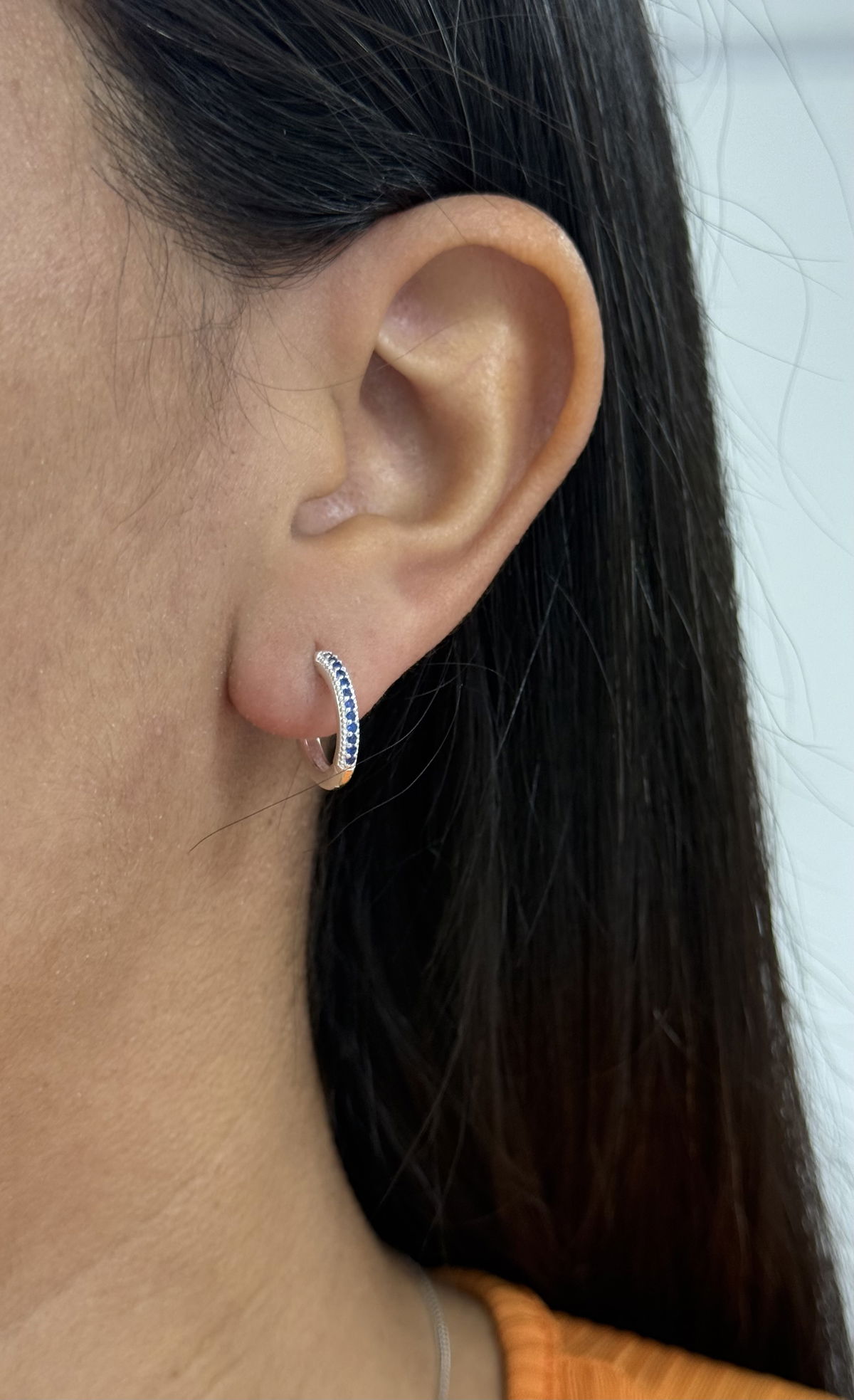 Argollas 1,4cm cierre clip piedra azul acero blanco.