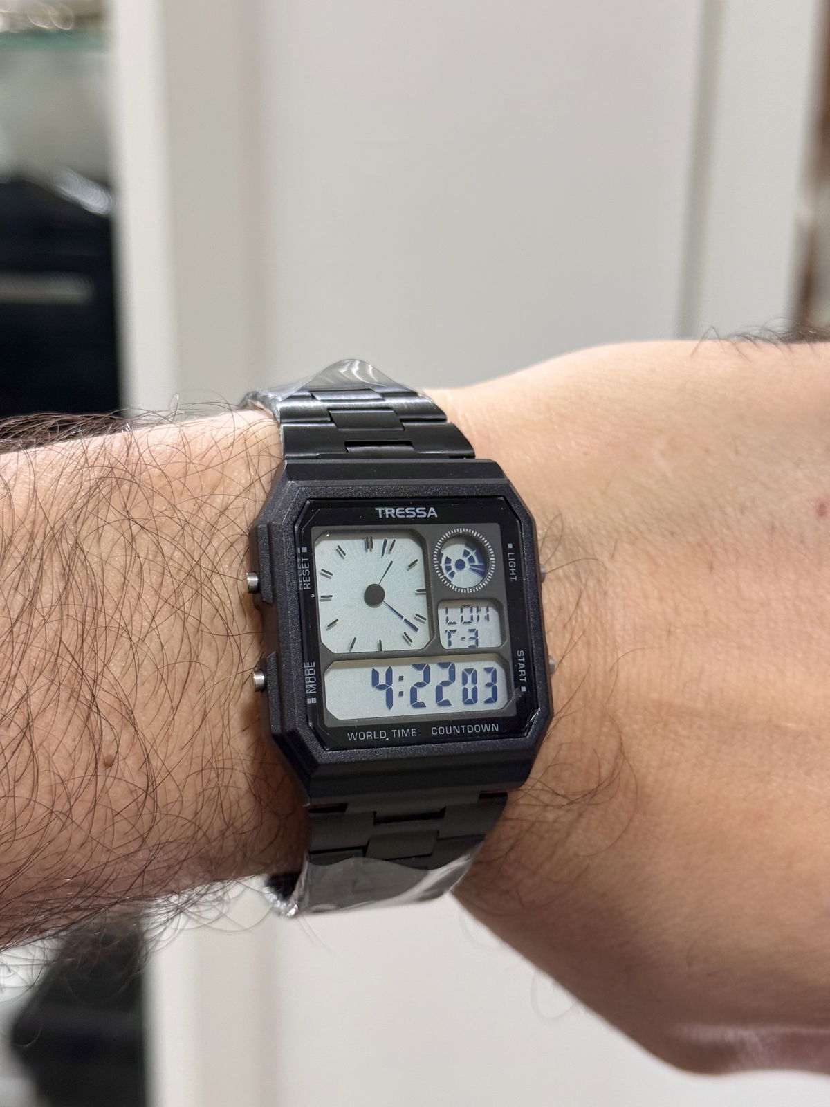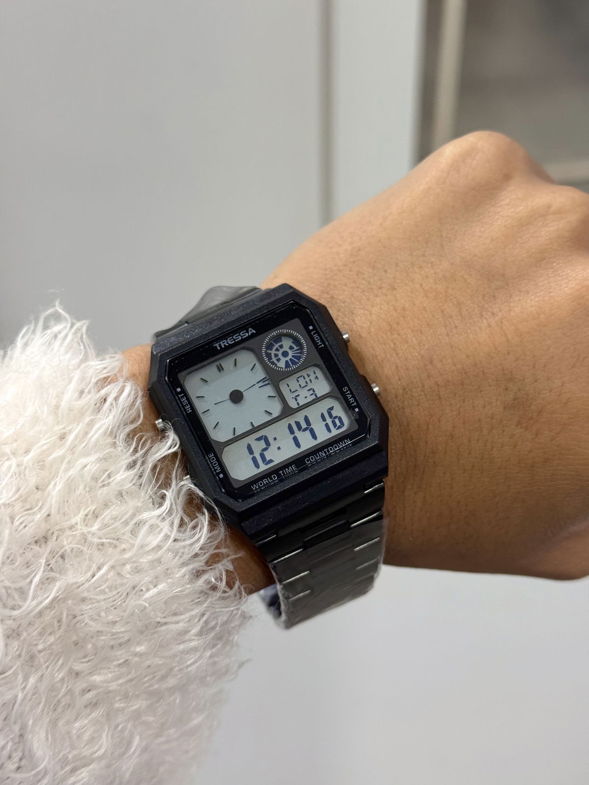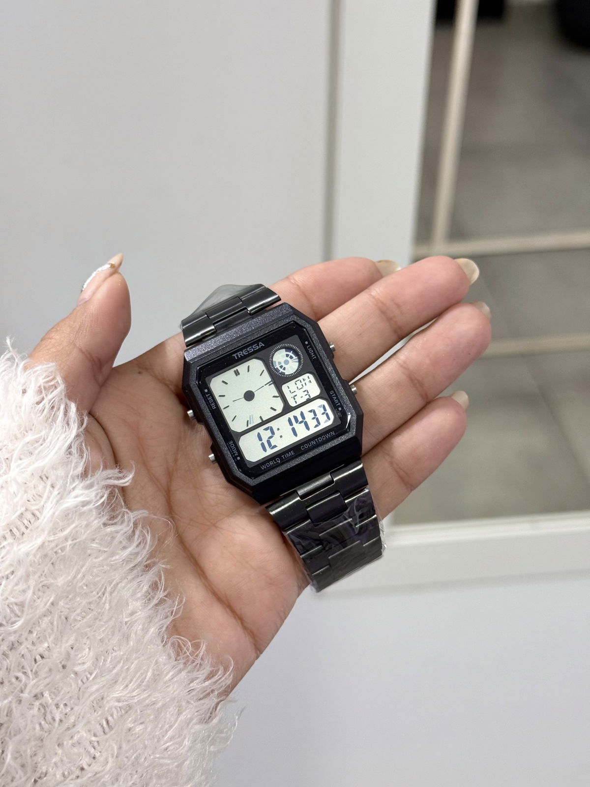 Reloj malla acero auto ajustable, digital, calendario, luz, cronómetro, resistente al agua, Tressa.