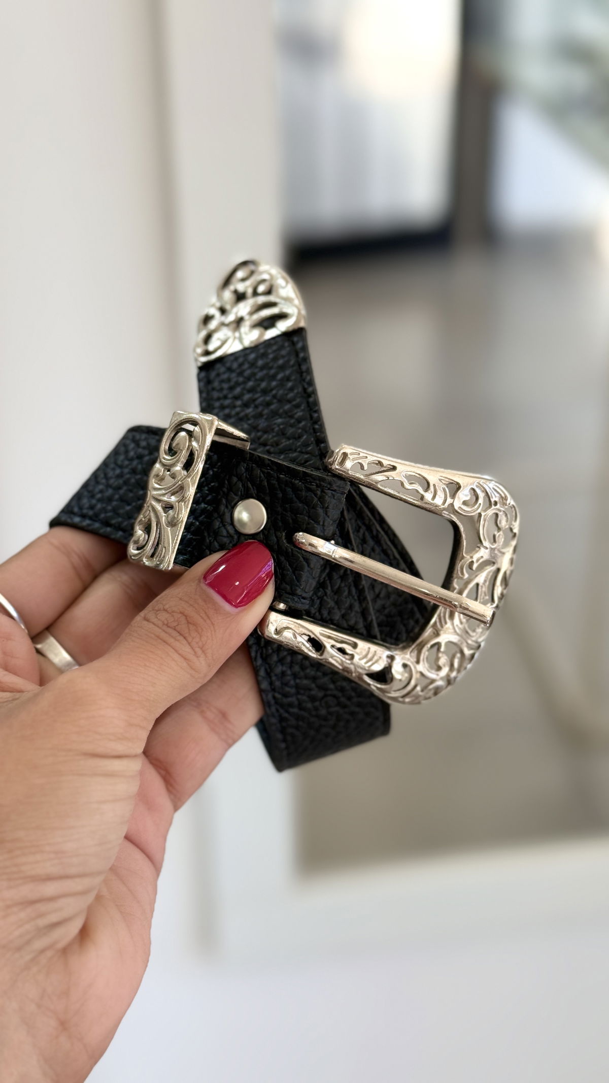 Cinto hebilla con textura plateada.