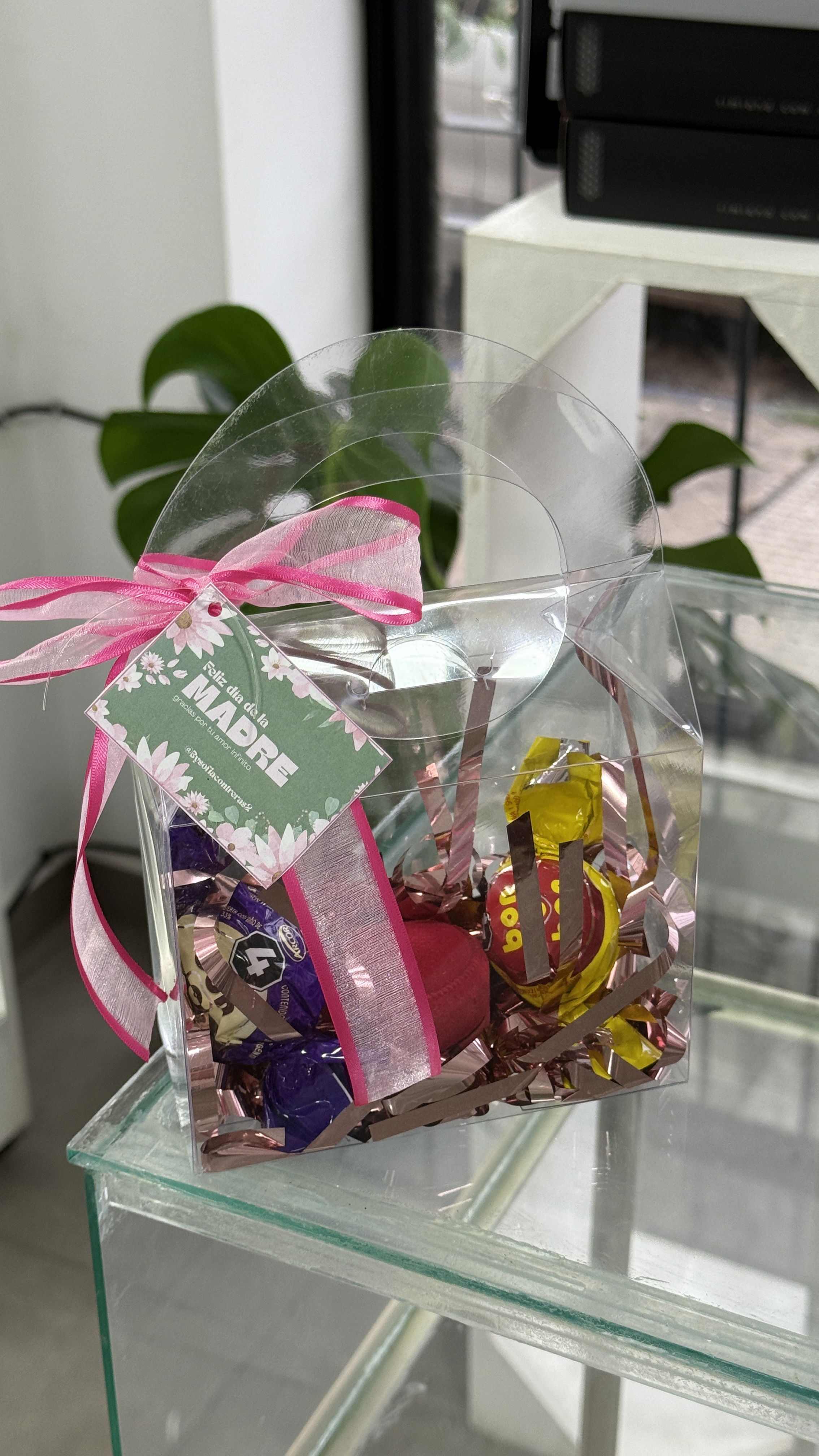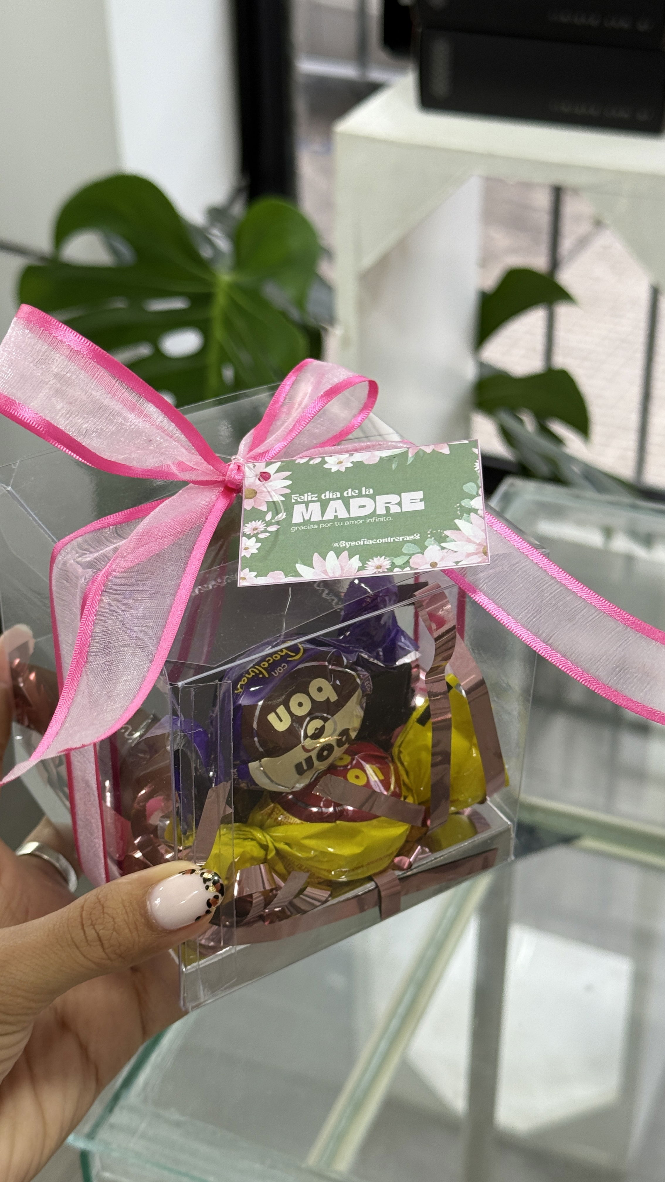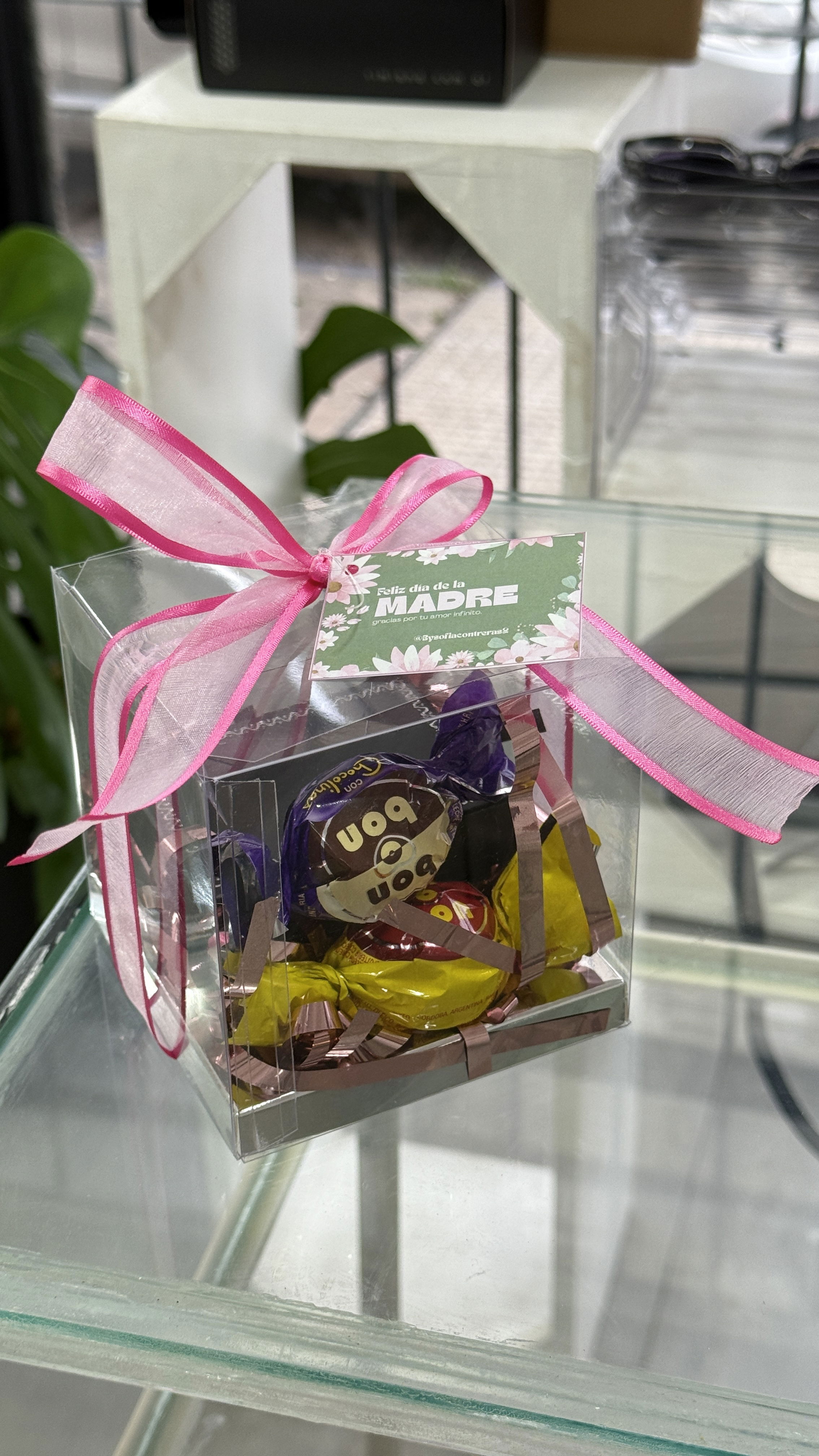 Box transparente con moño, tarjeta y bombones bon o'bon.