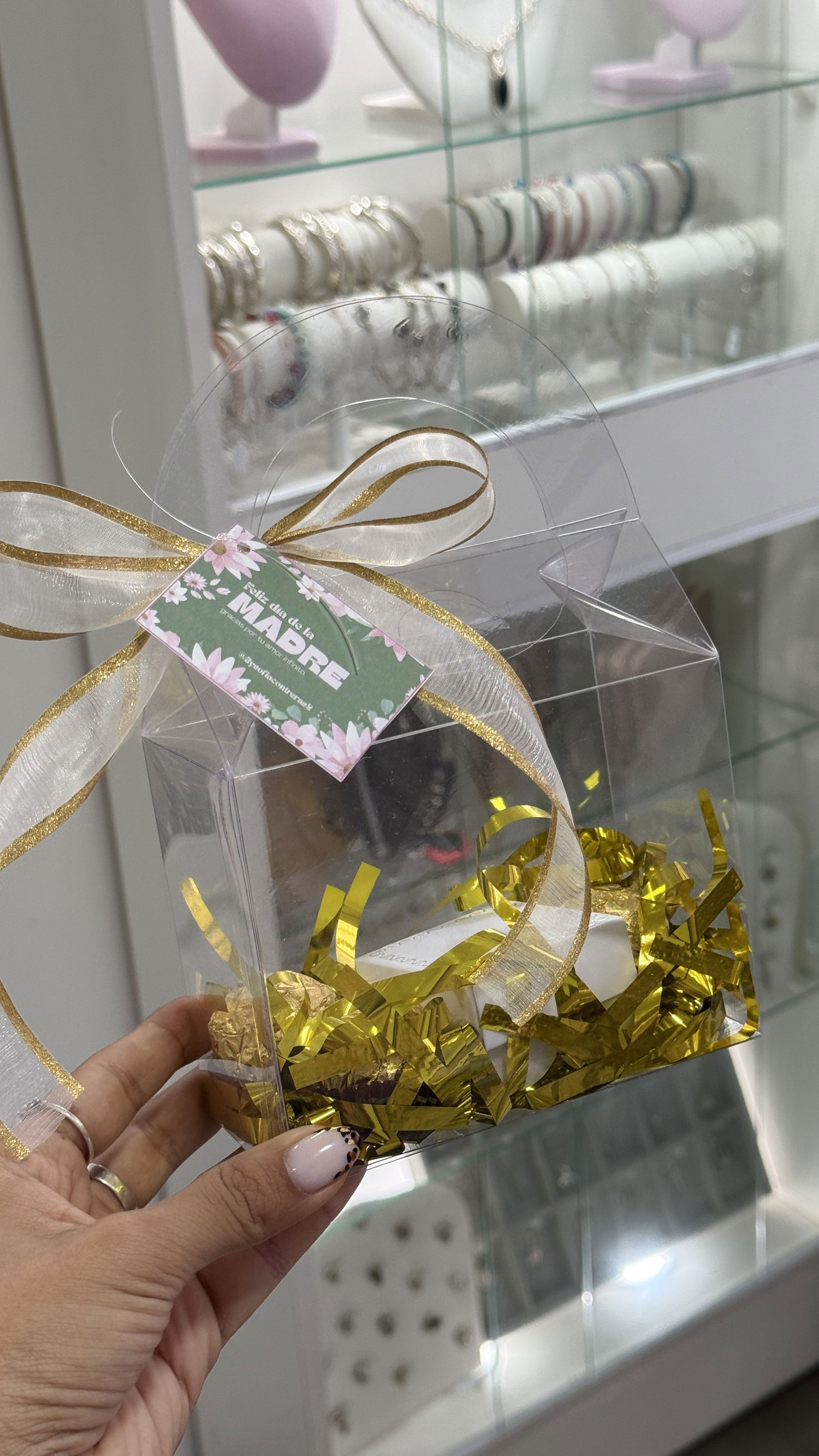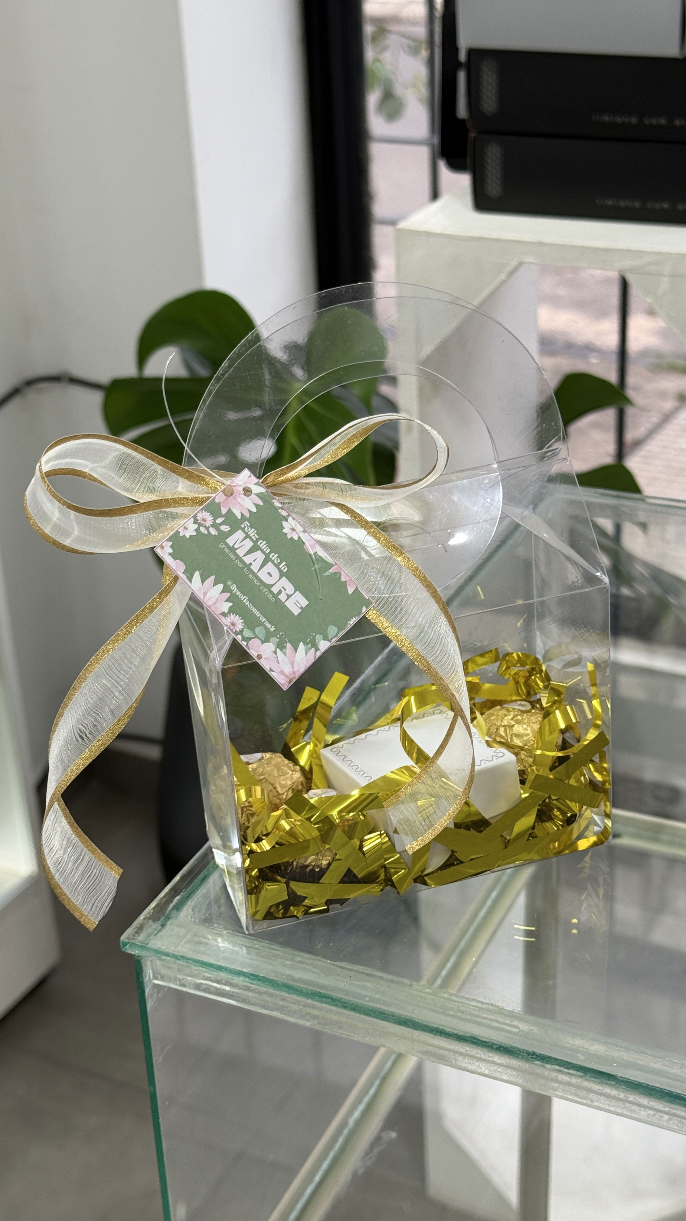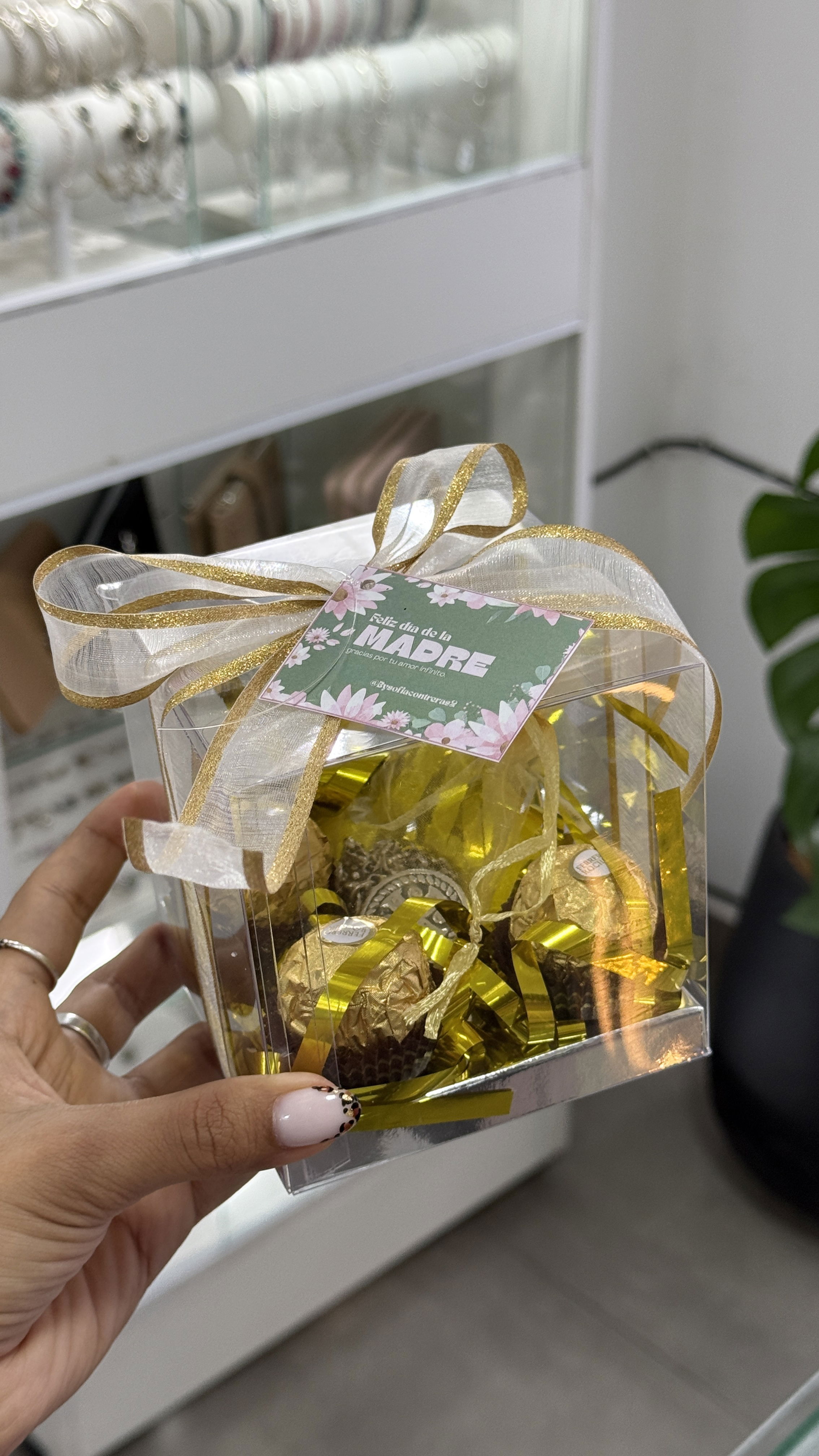 Box transparente con moño, tarjeta y bombones Ferrero rocher.