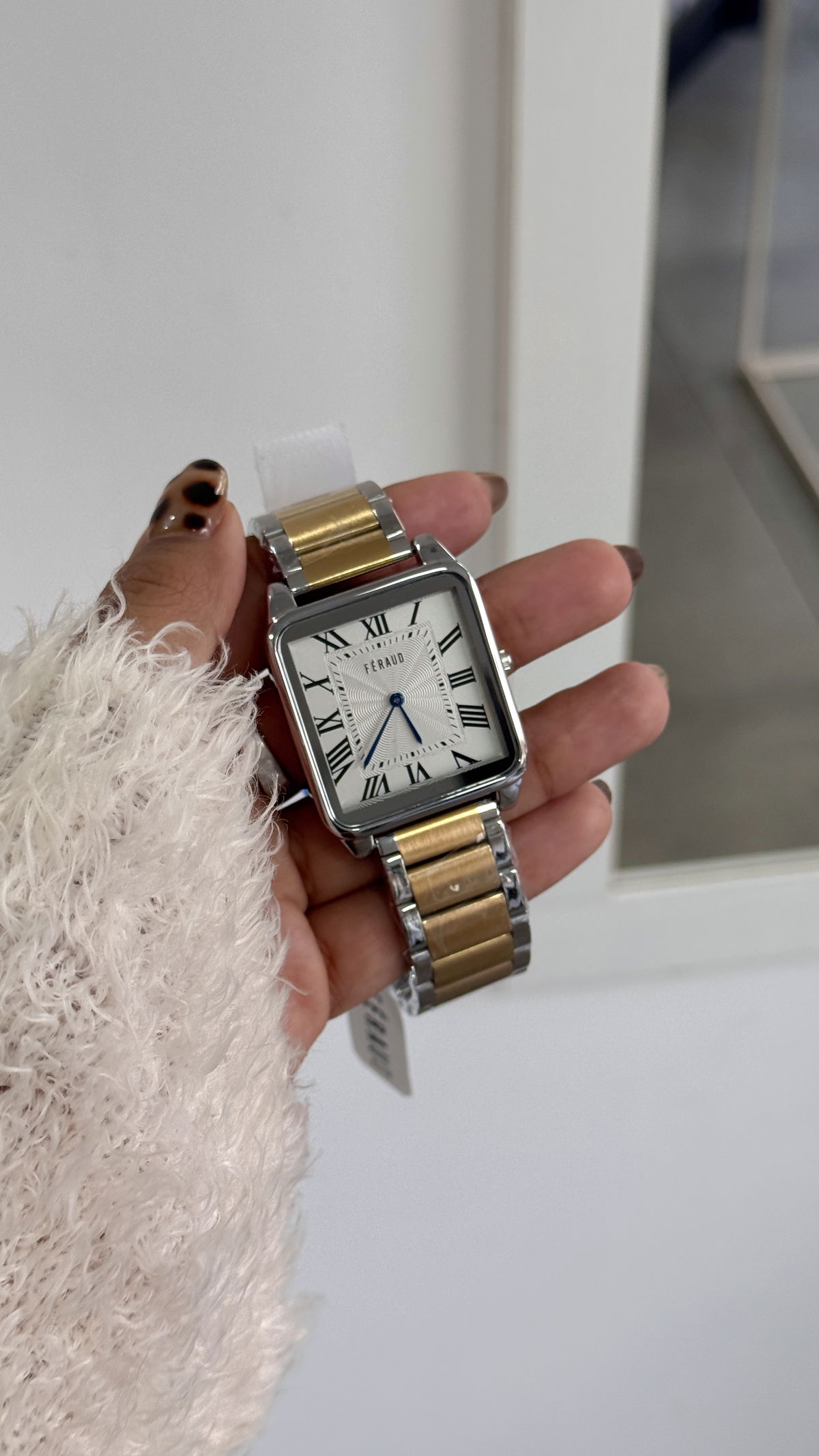 Reloj acero inoxidable, combinado con dorado, números romanos, resistente a salpicaduras, Feraud.