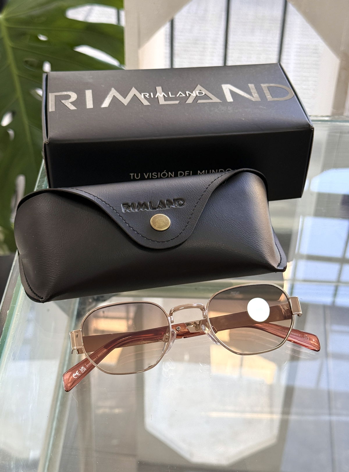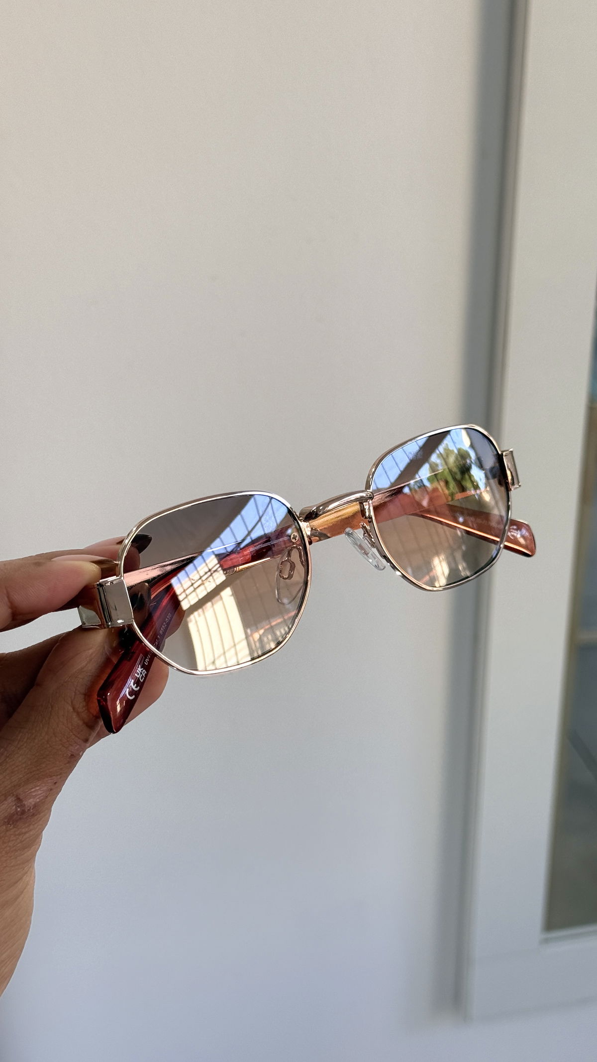 ARMAZÓN DE ACERO INOXIDABLE EN COLOR DORADO CON DETALLES EN MARRÓN. LENTES DE POLICARBONATO EN TONO DEGRADÉ.