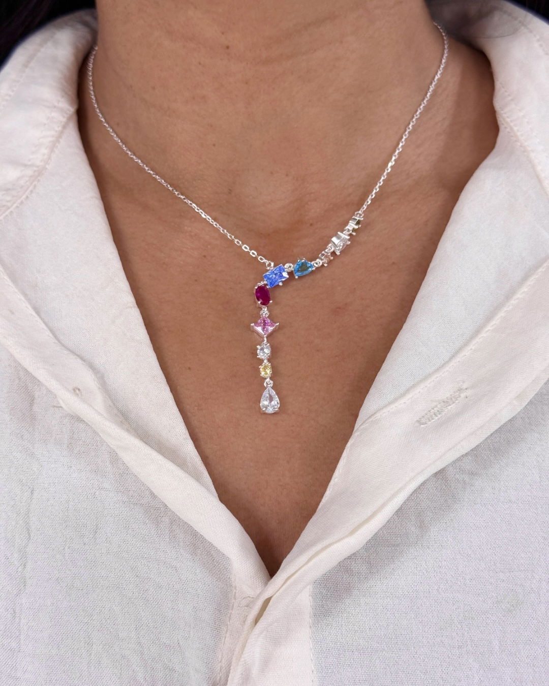Collar tipo corbatero con cúbics colores, 45cm plata925.