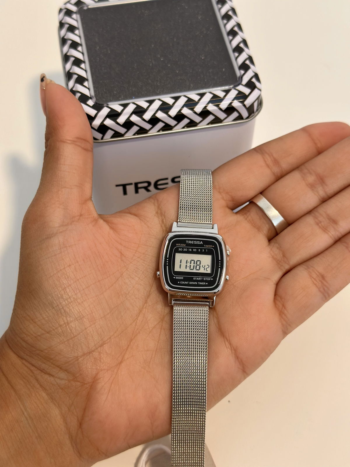 Reloj digital, Tressa, malla metal tejida ajustable, calendario, cronómetro, resistente a salpicaduras.