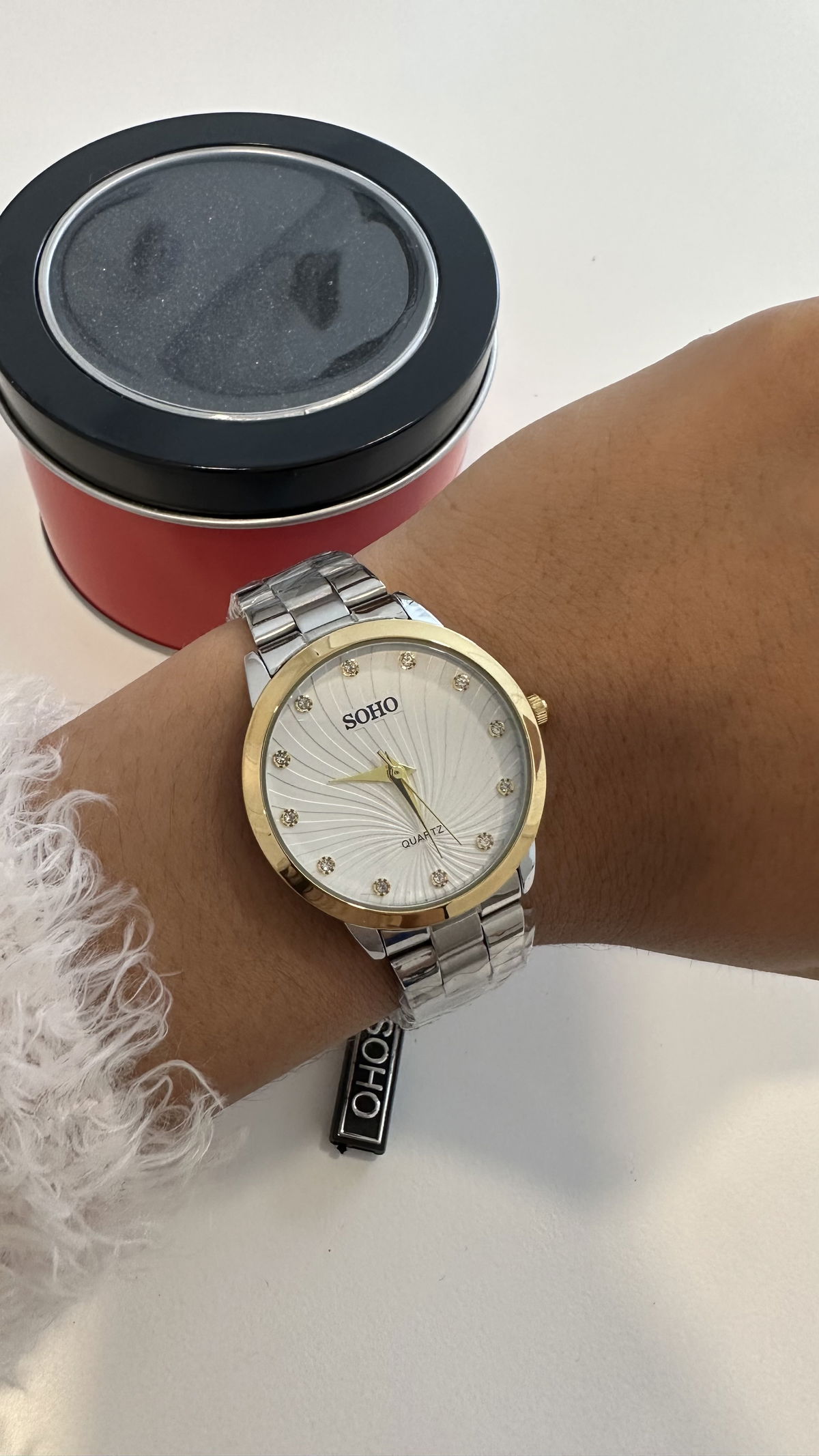 Reloj soho malla de metal con combinación dorada, resistente a salpicaduras.