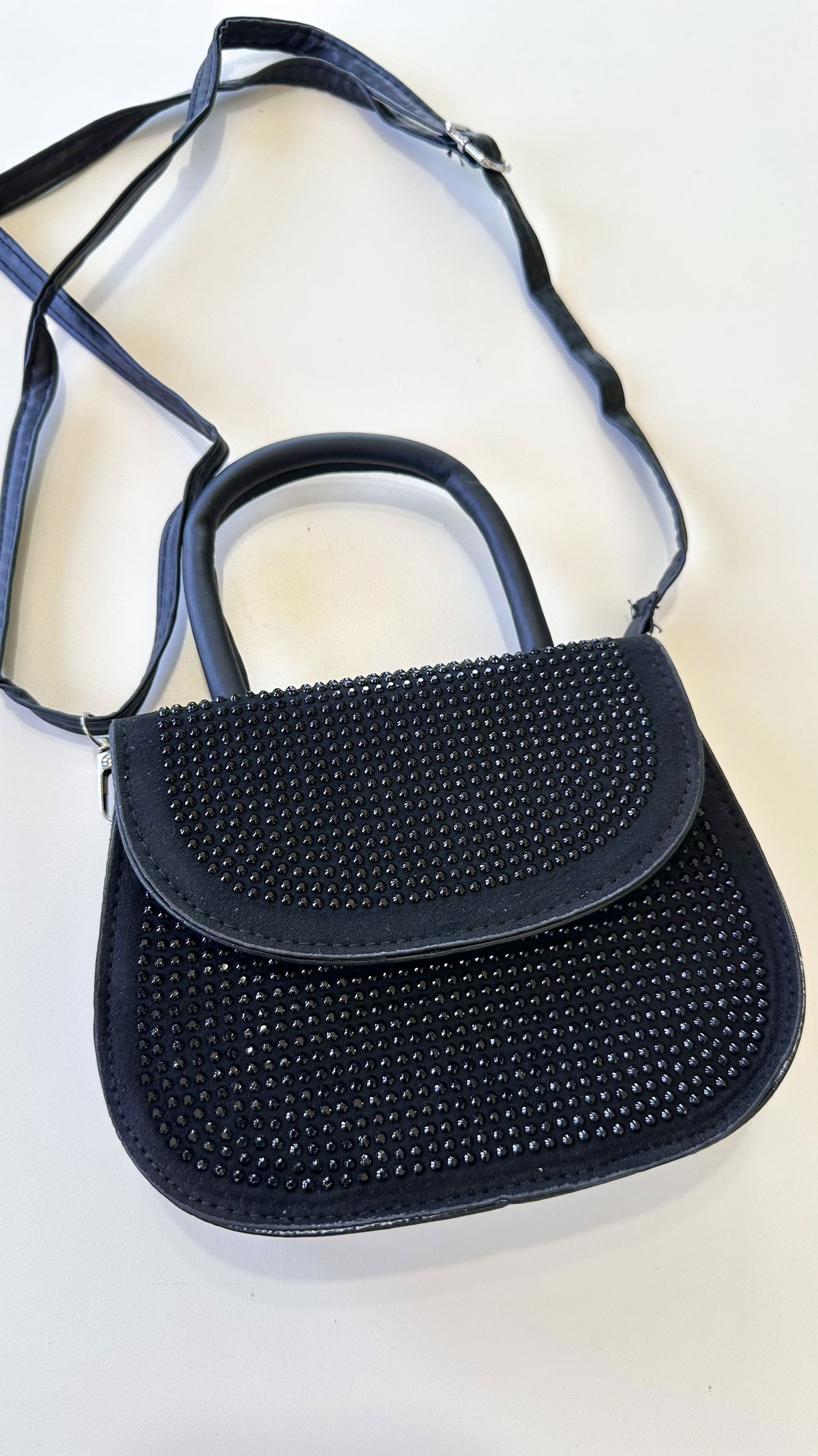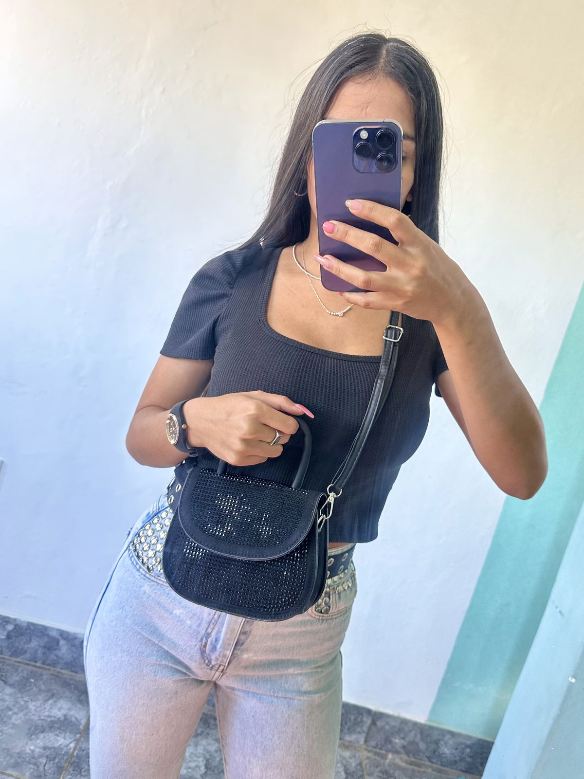 Mini Bags cuero pu 19x15 con strass en negro y correa desmontable.