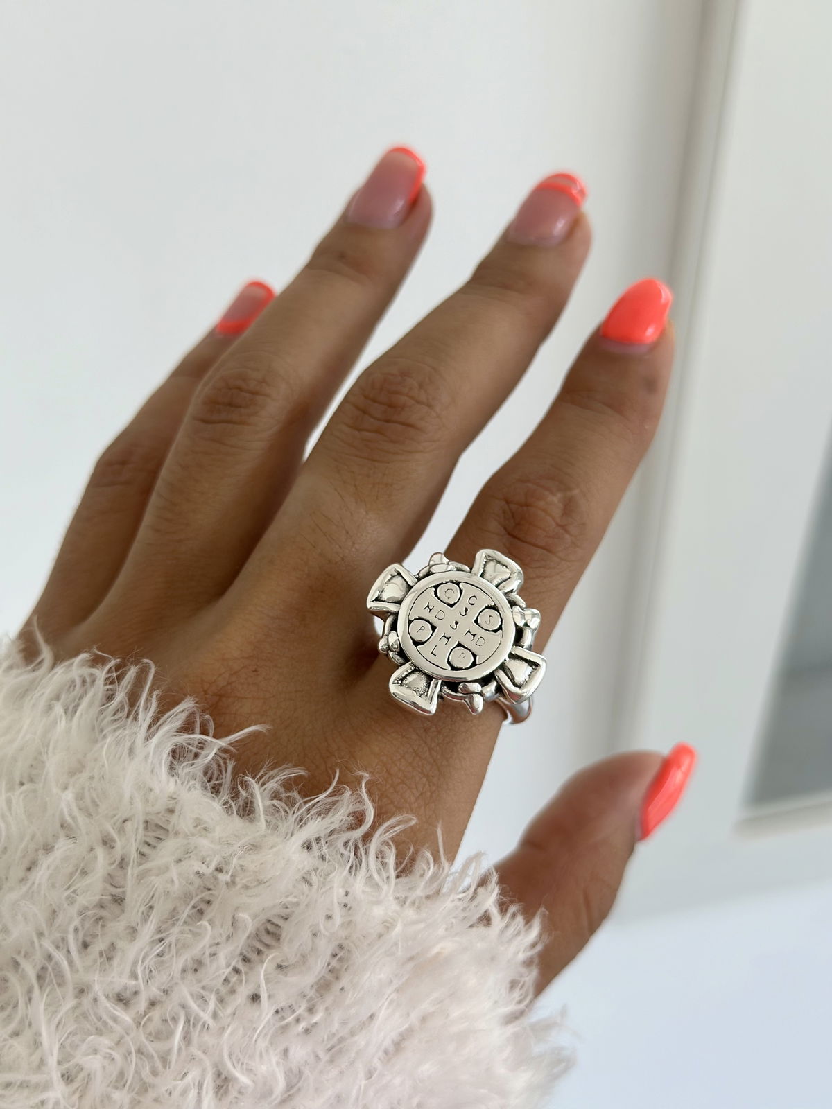 Anillo cruz San Benito Plata inflada. Medida 18mm.