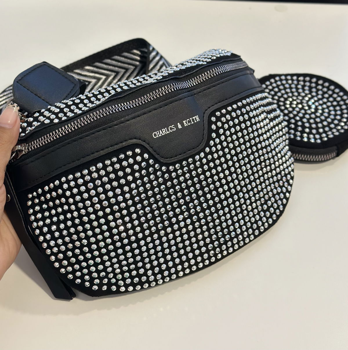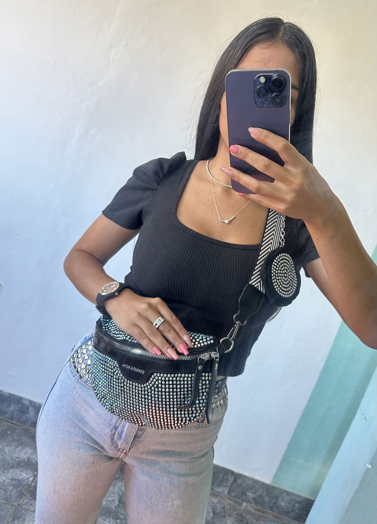 Riñonera cuero pu 22x17 con strass plateado , con cierre interior y monedero desmontable.