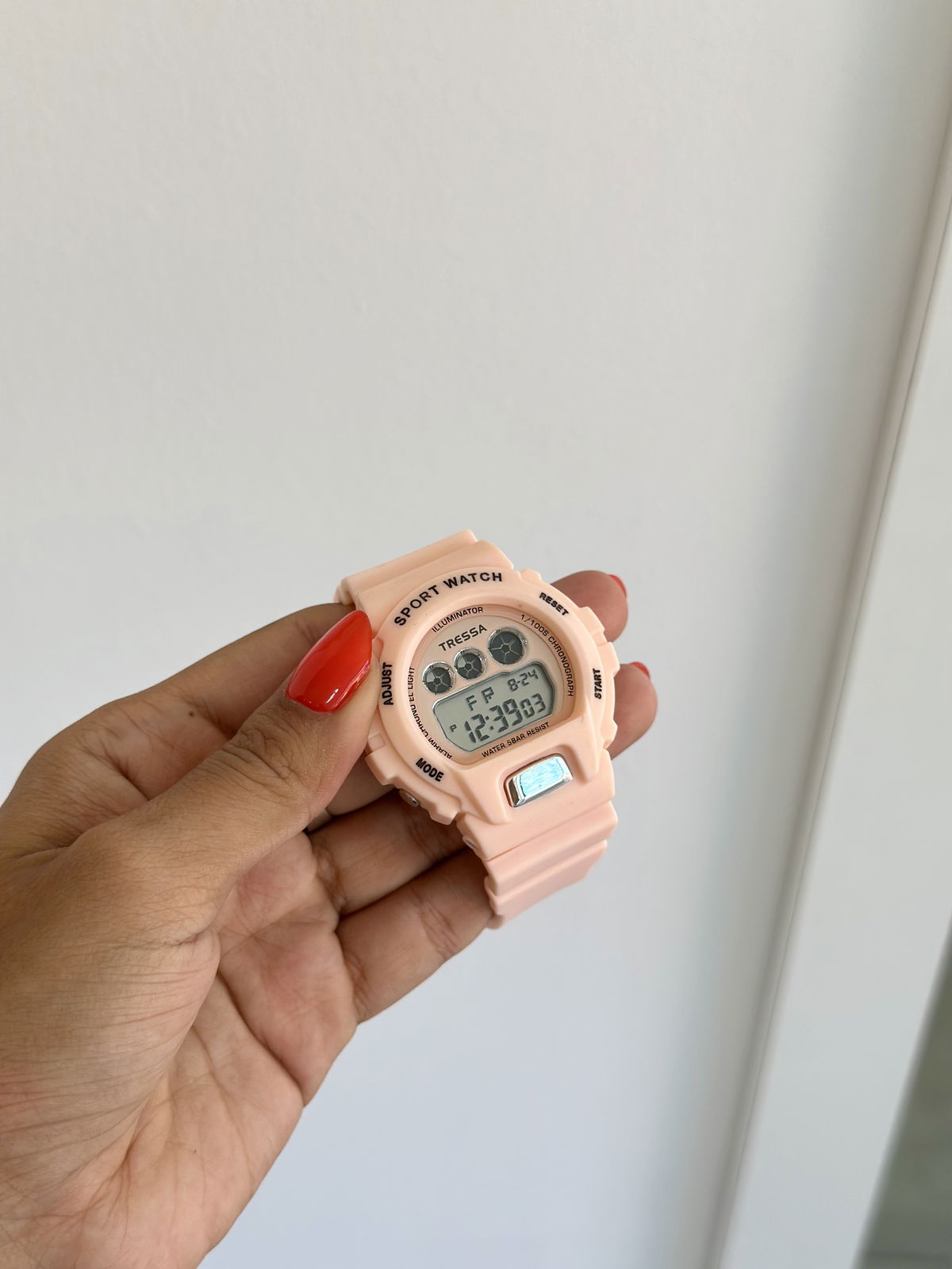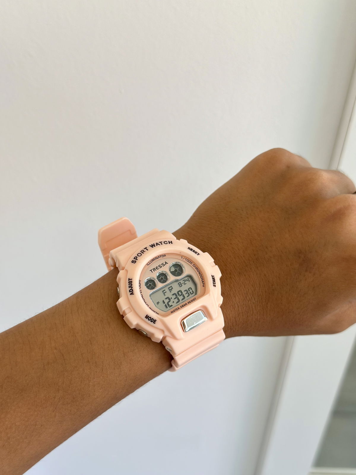 Reloj Tressa deportivo caucho color durazno, alarma, calendario, cronómetro, luz, sumergible.