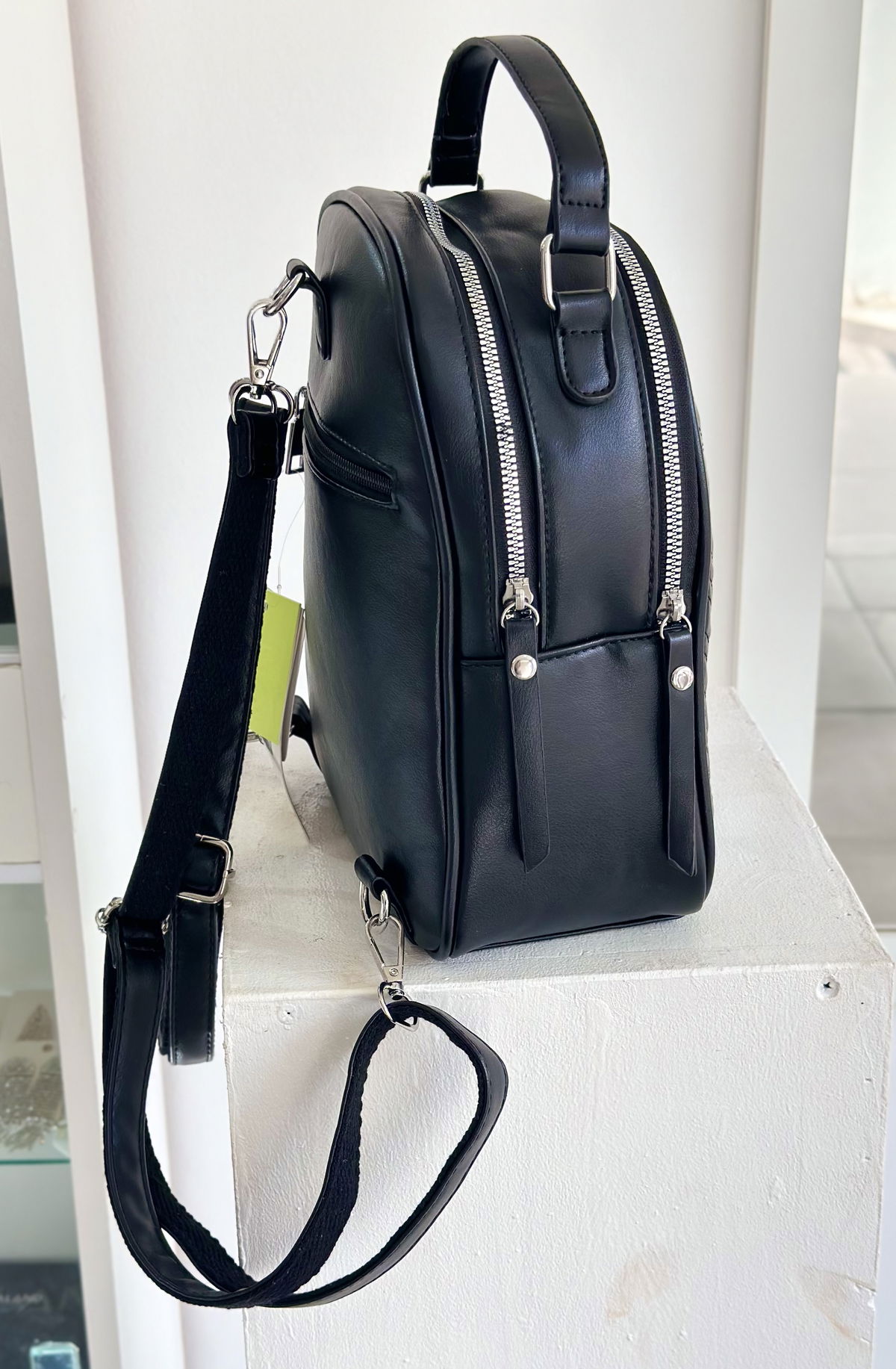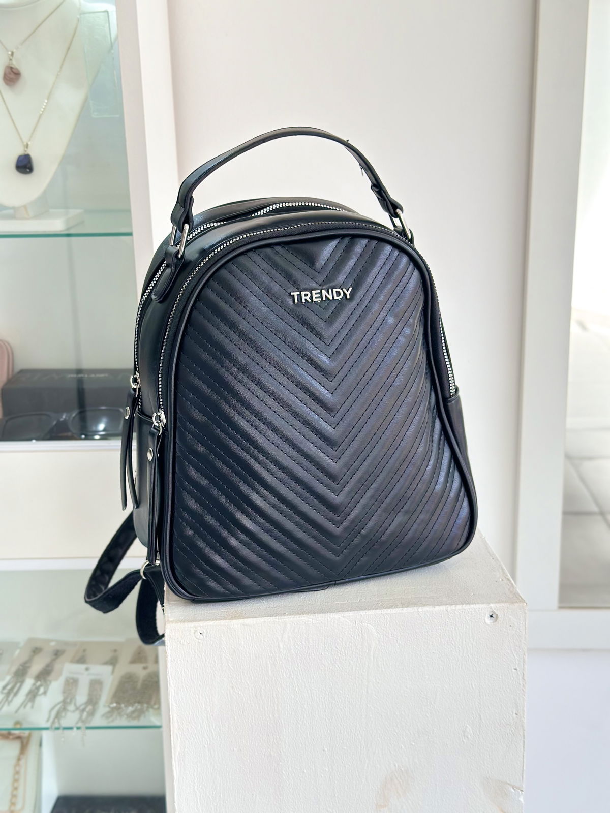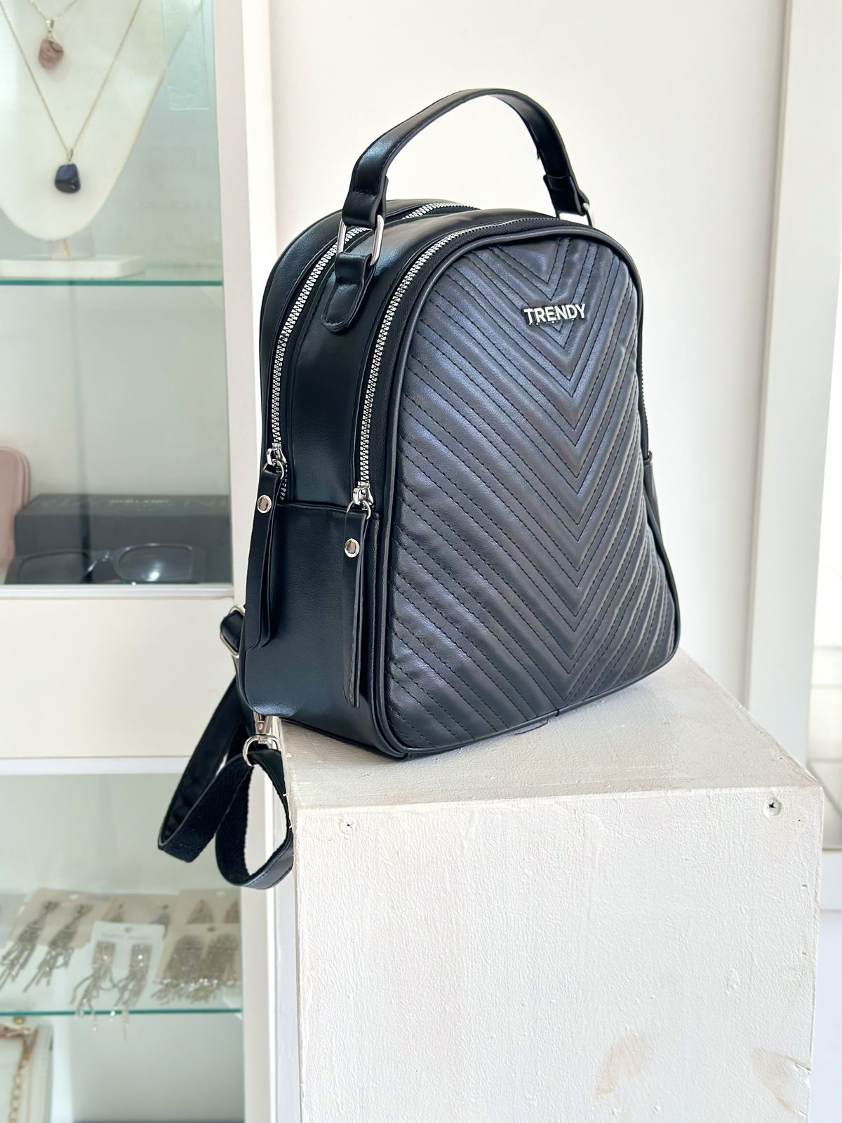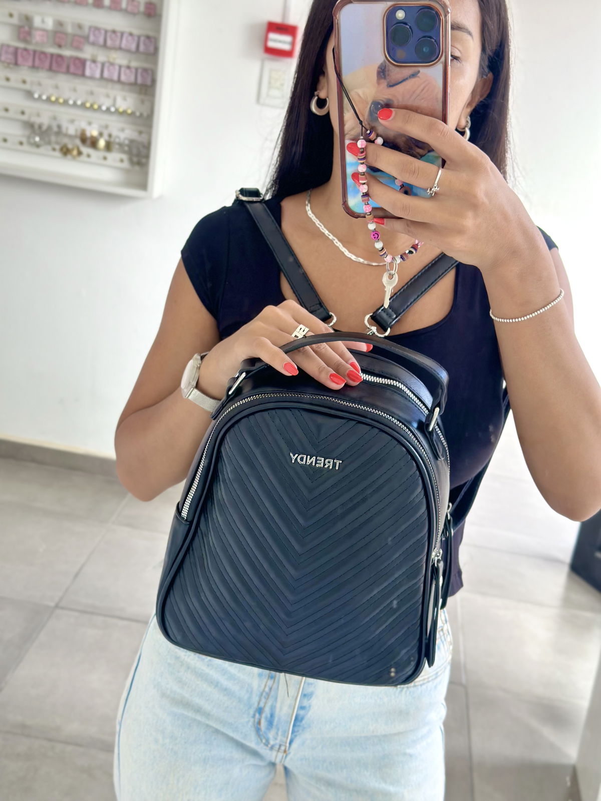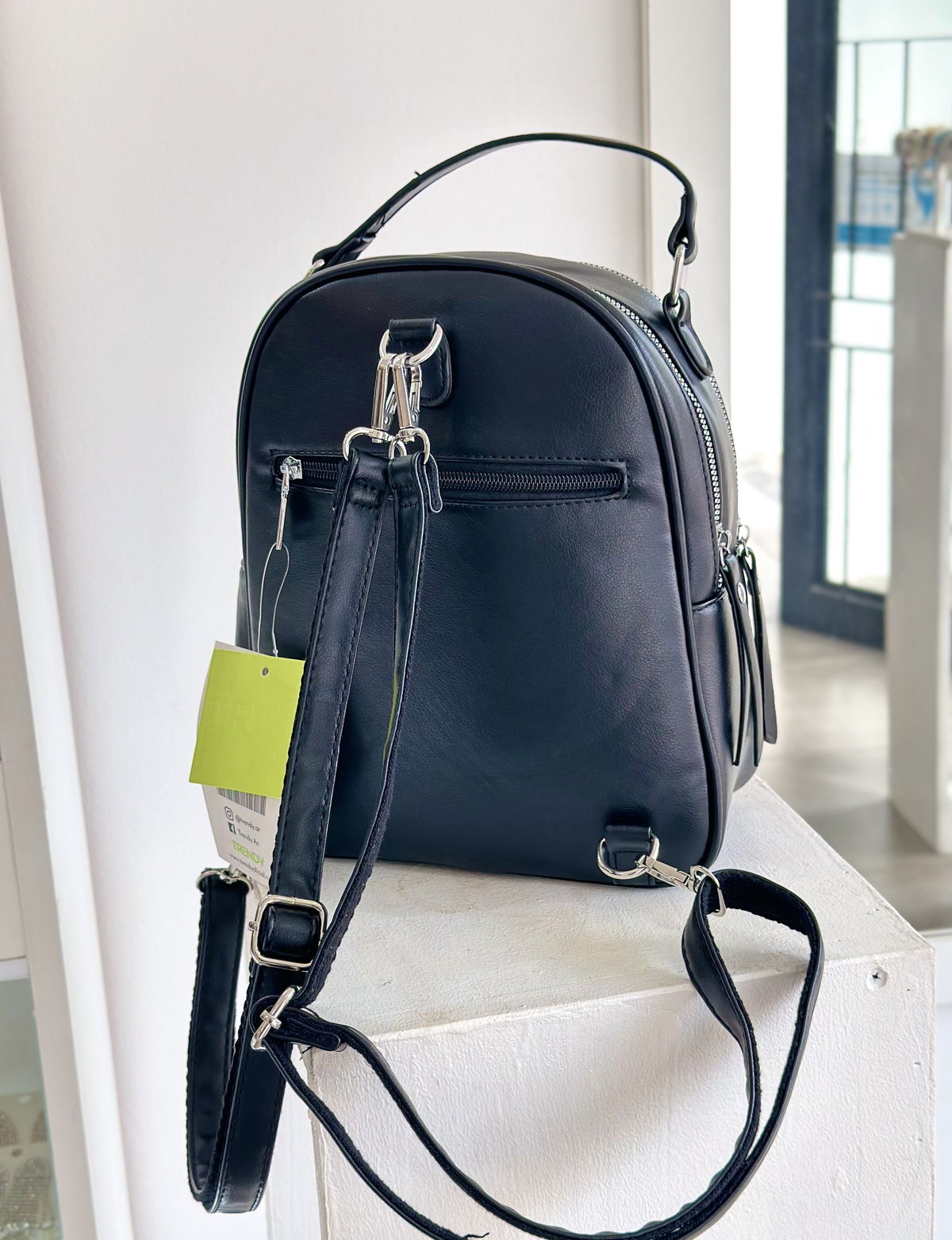 Mochila trendy confeccionada en cuerpo PU, altura 27cm, ancho 22cm, 11cm de profundidad.