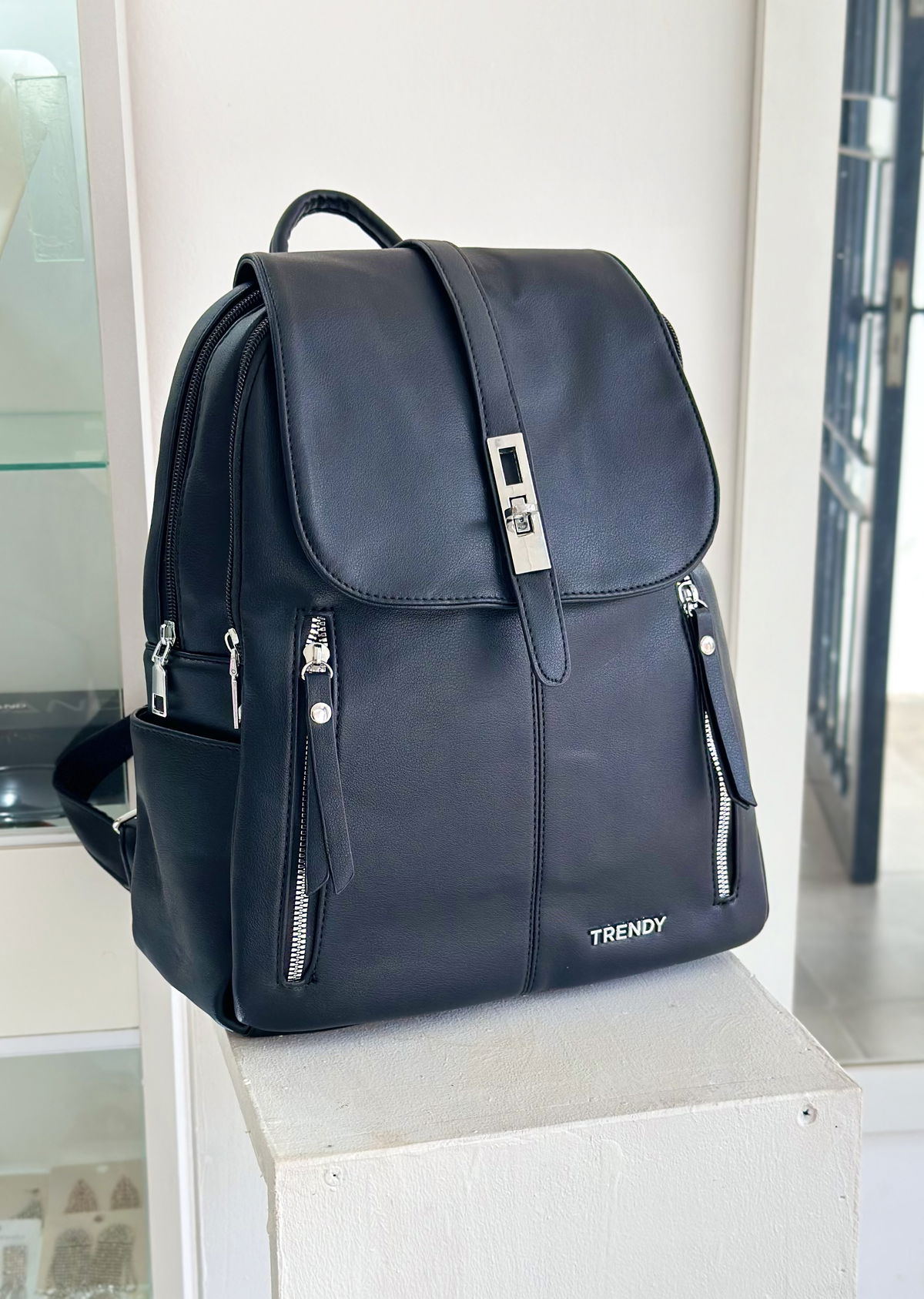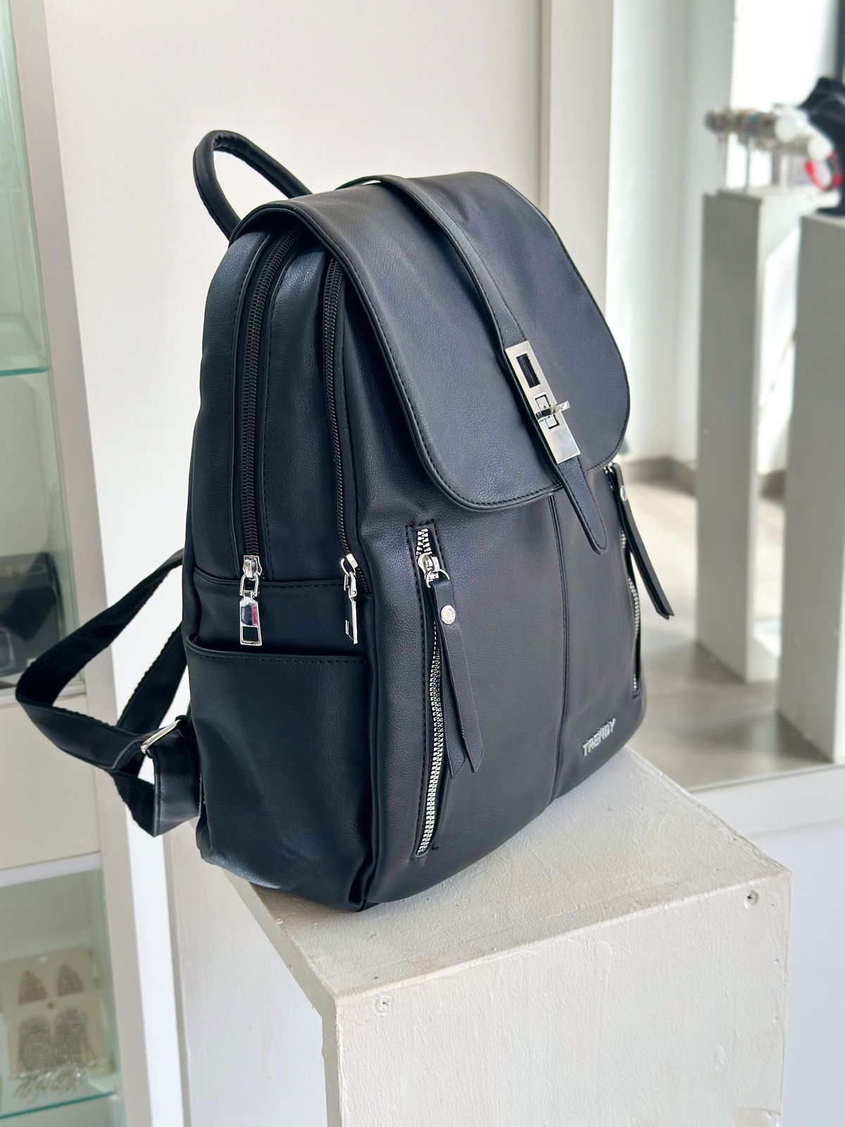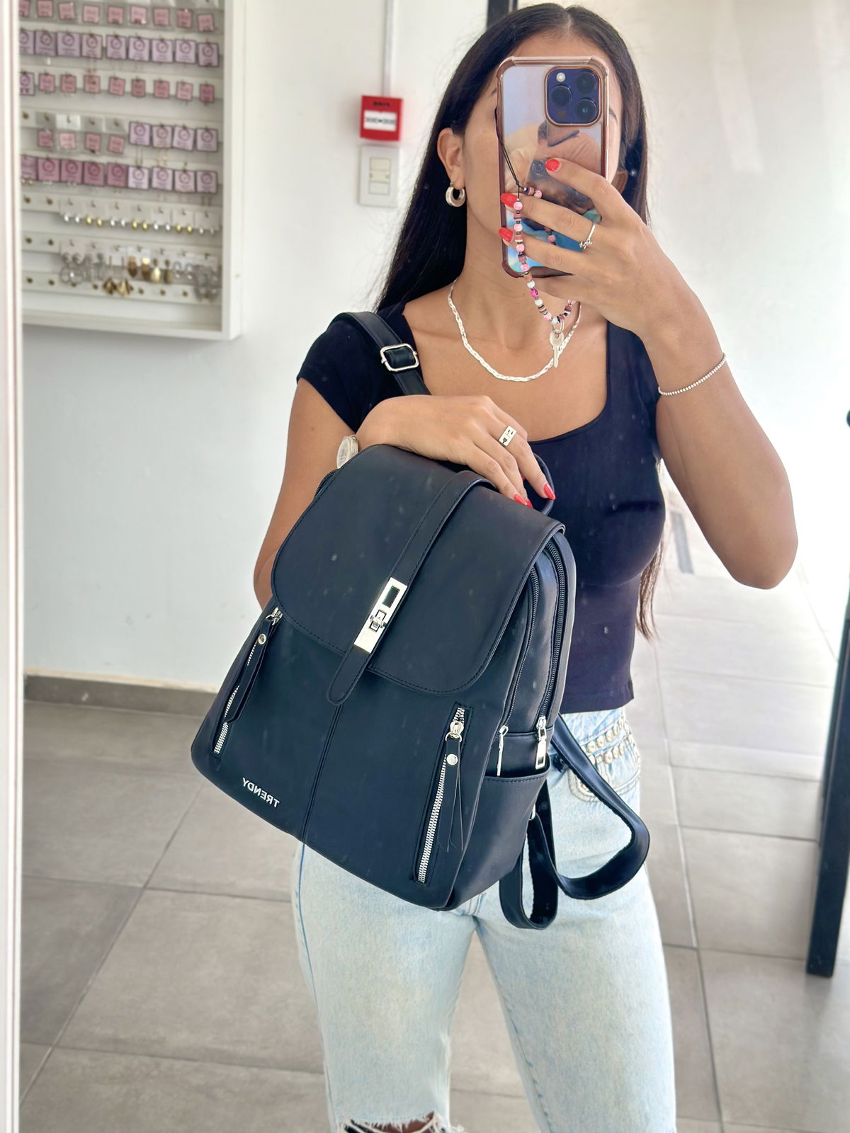 Modelo con tapa, 4 cierres delanteros, bolsillos en los costados, interior forrado con cierres.