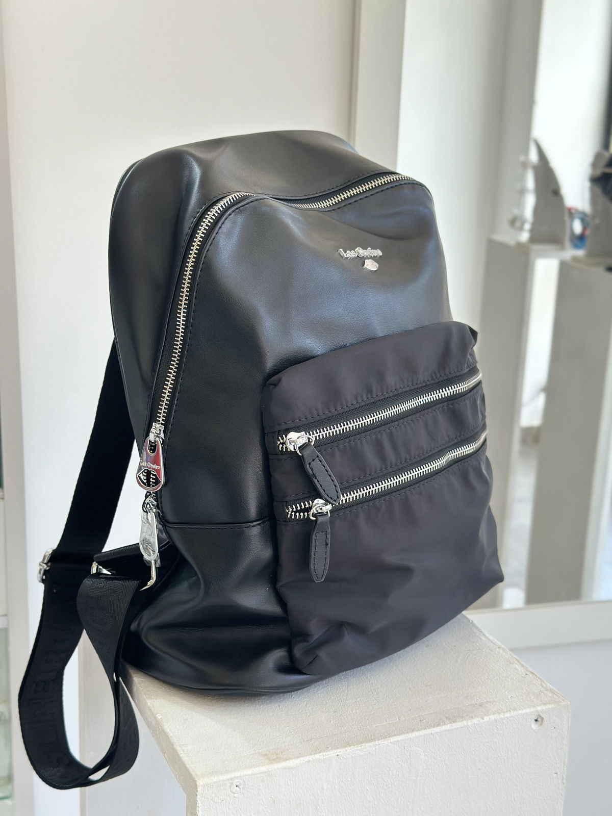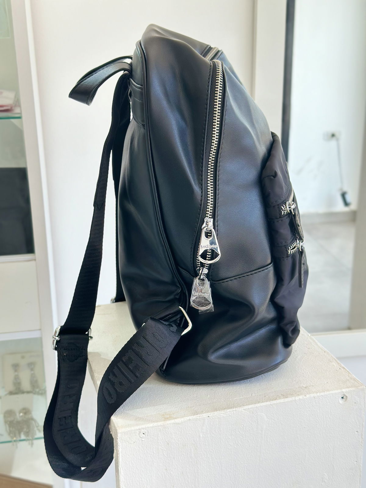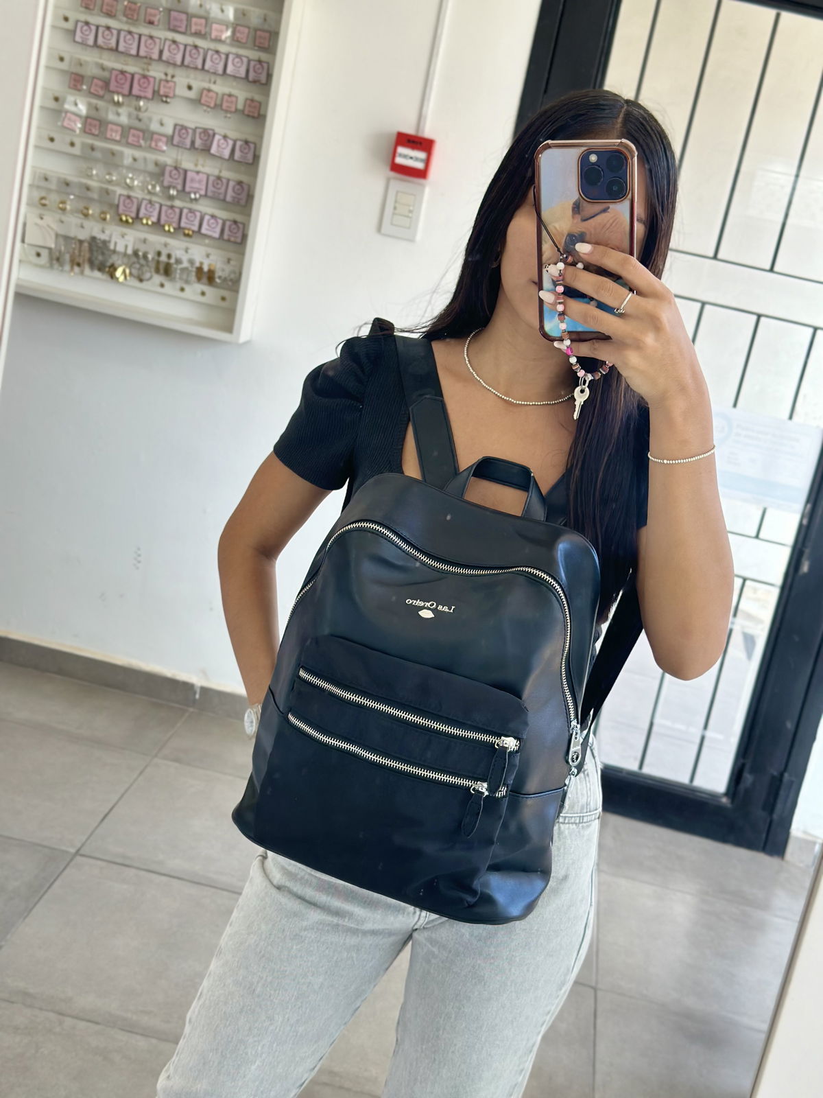 Mochila cuerina pu, alto 34cm, ancho 27cm, 12cm de profundidad, interior forrado con cierres y comorpartimientos y gancho para sujetar llaves.