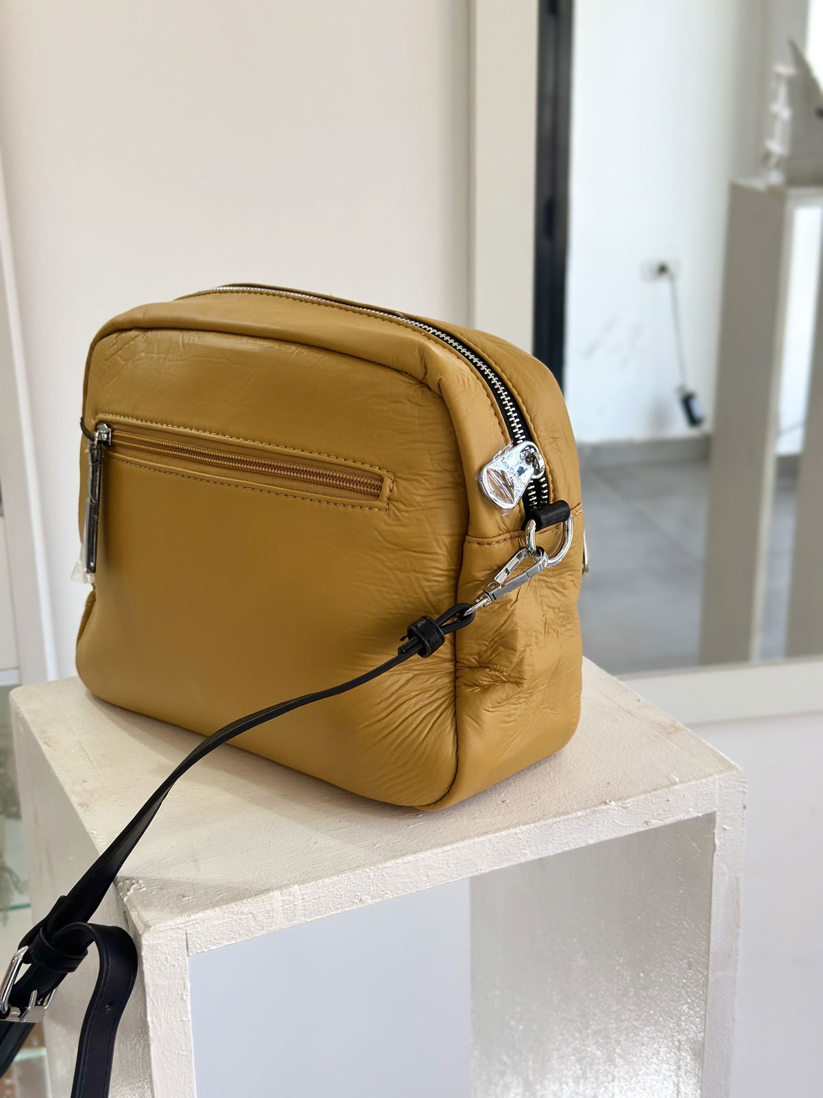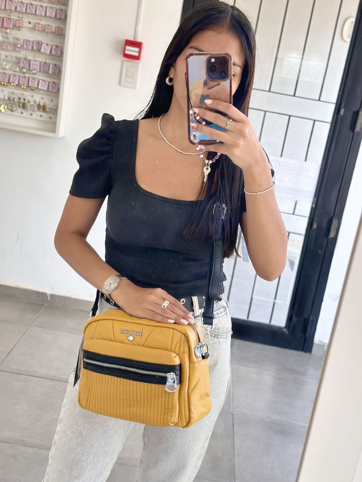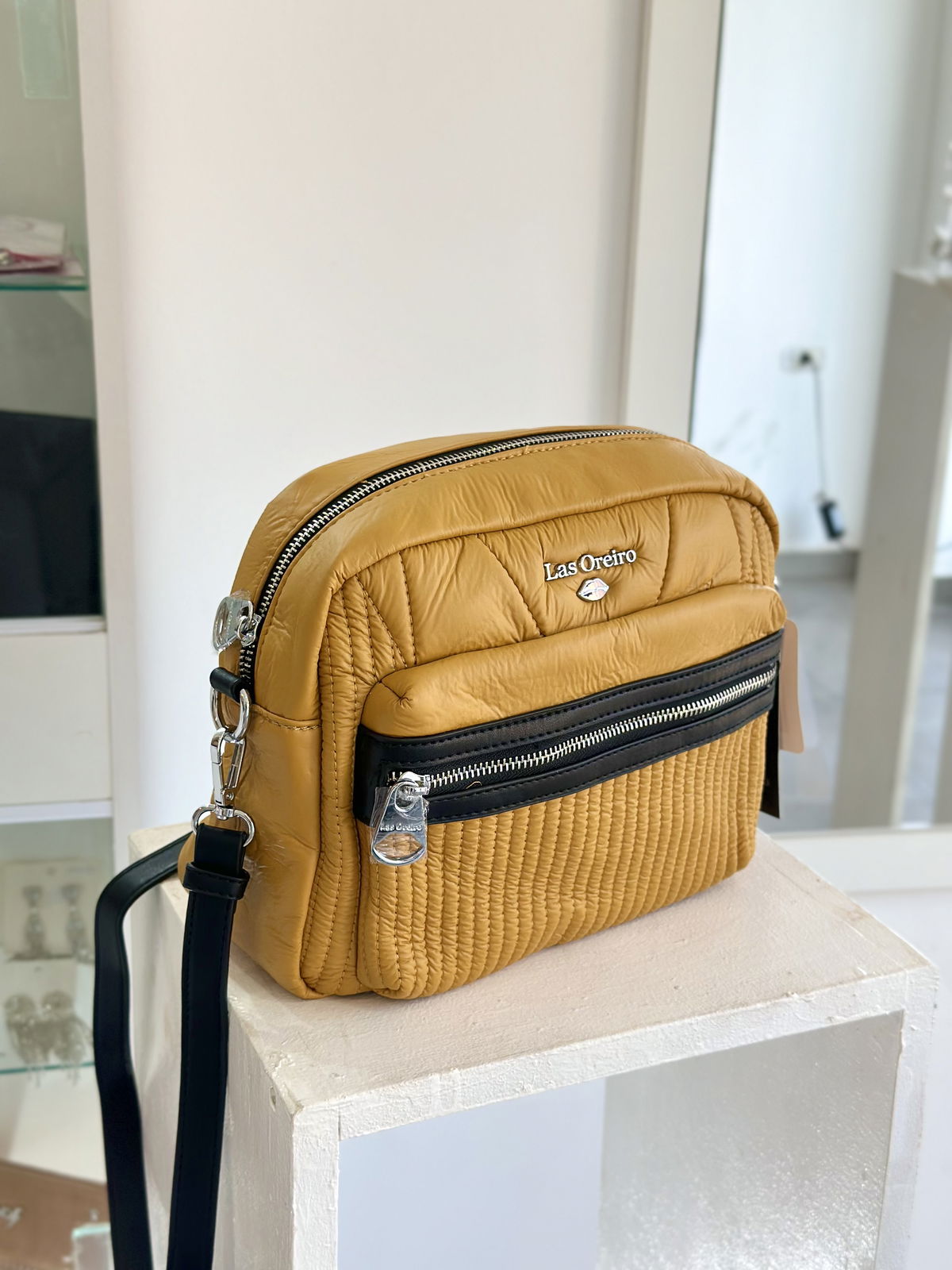 Bandolera tipo puffer, 20cm alto, 26cm ancho, 10 de profundidad. Cierre delantero, y cierre atrás.