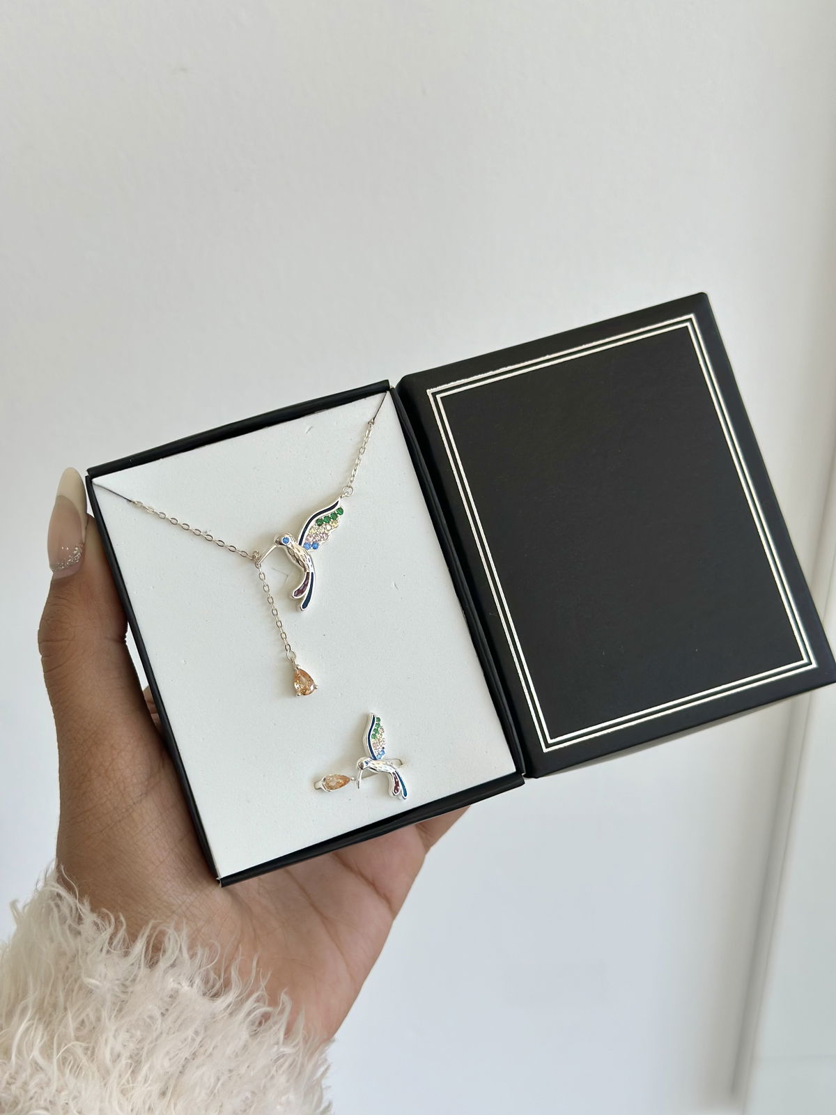 Set gargantilla tipo corbatero + anillo ajustable colibrí colores plata925.