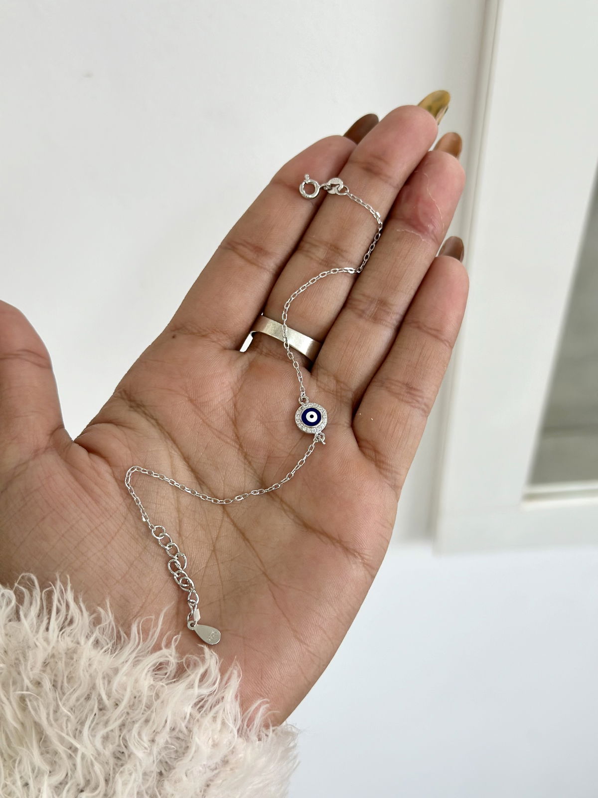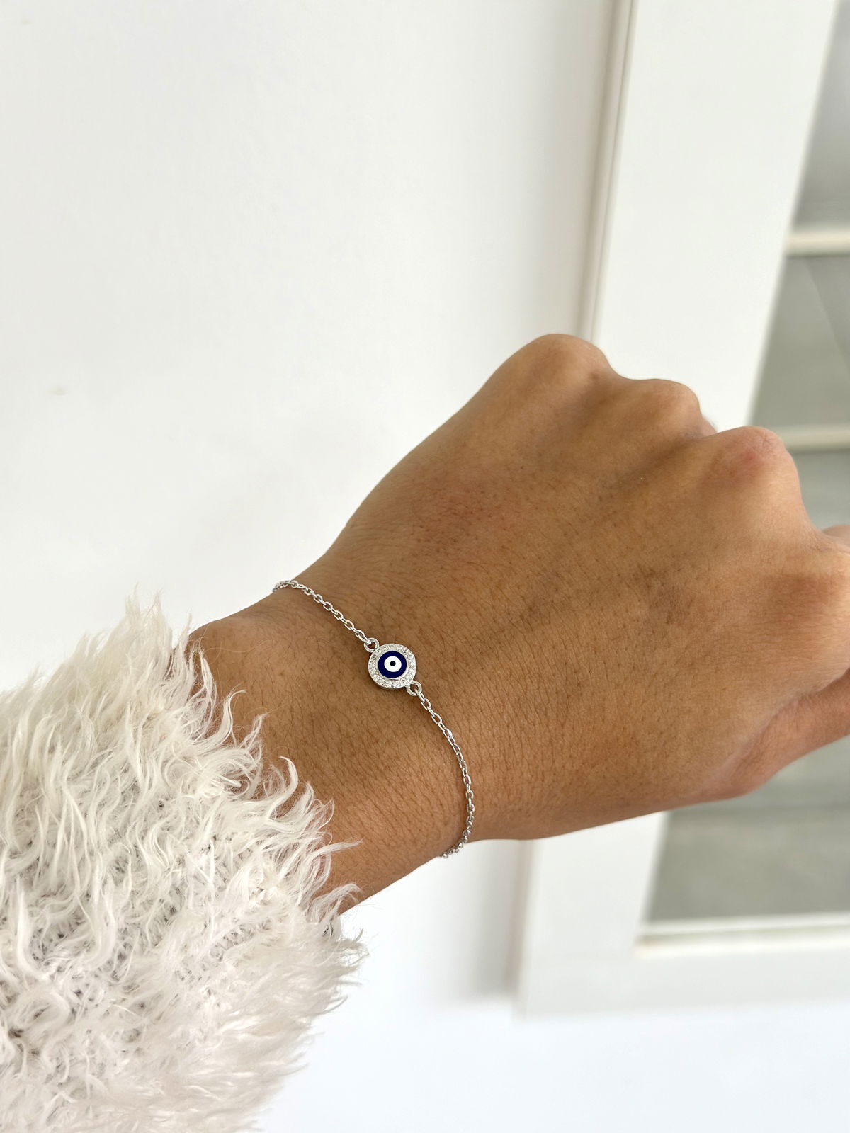 Pulsera ojito turco con cristales, 17cm con extensor de cadena para ajustar 20cm en total, plata925.