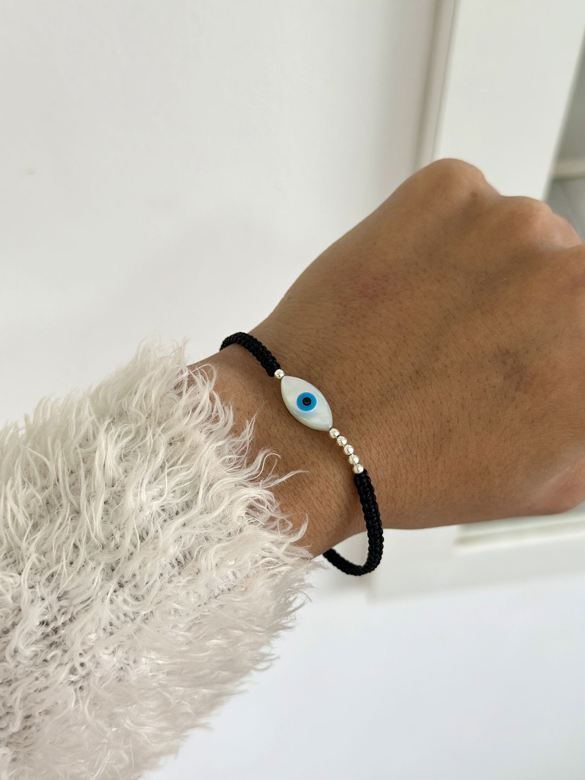 Pulsera hilo ajustable con ojito turco de nácar y bolitas plata925.