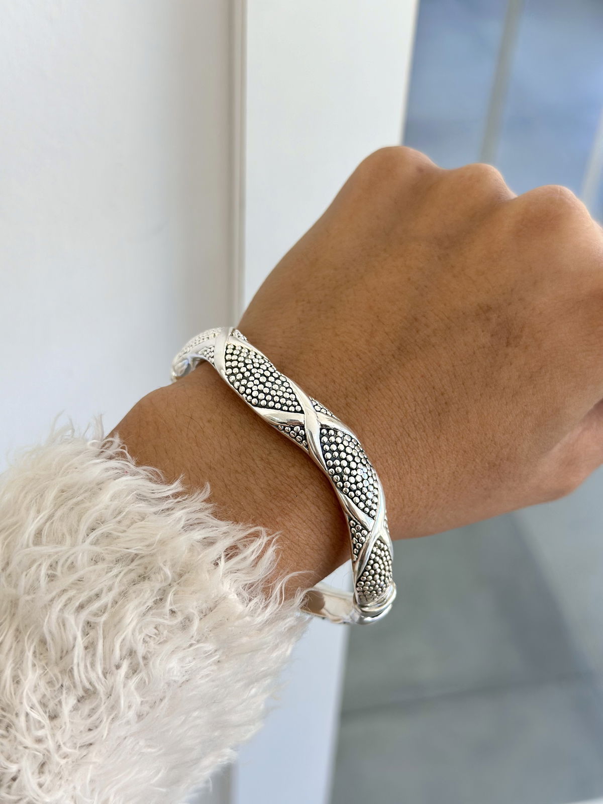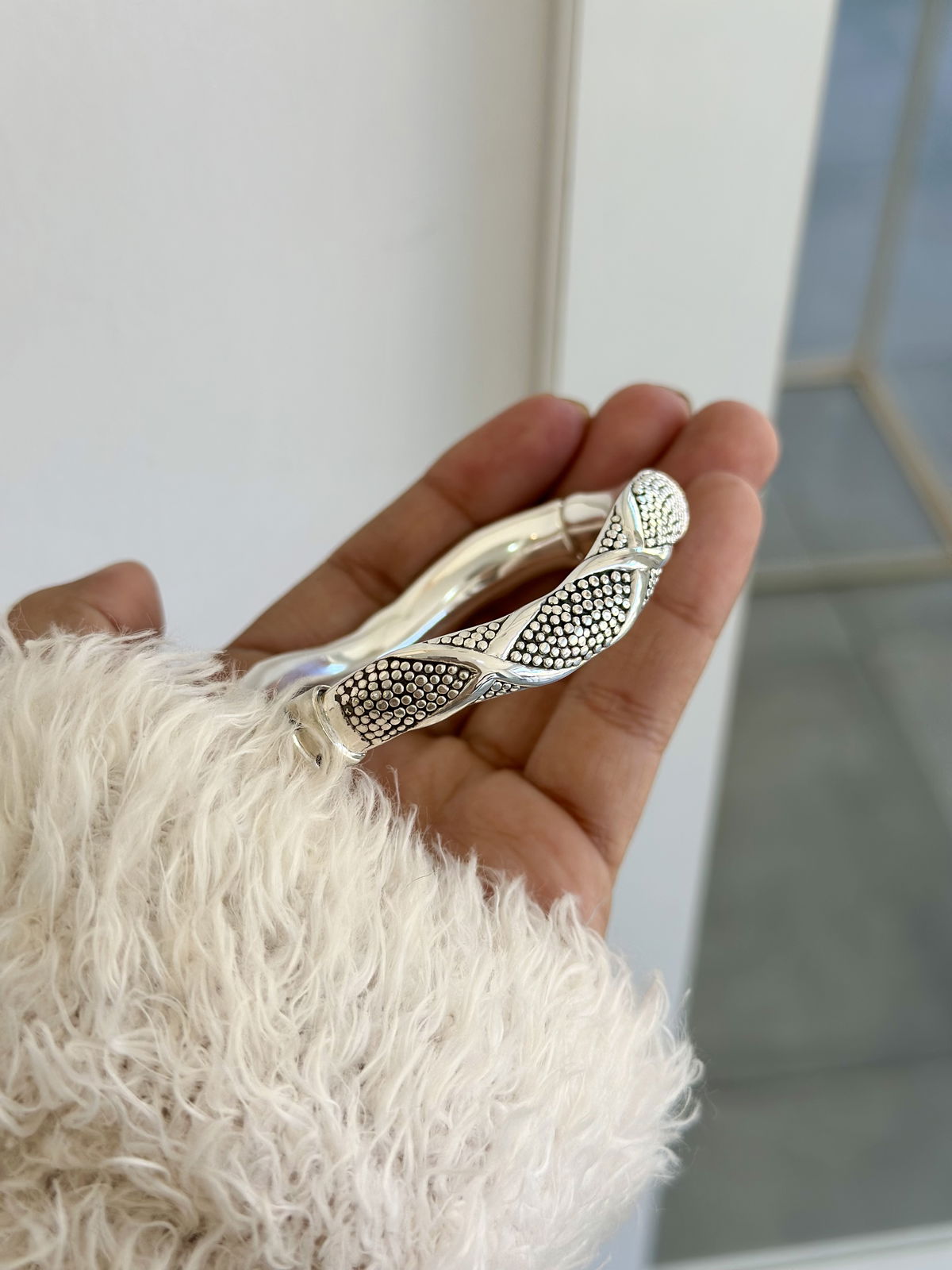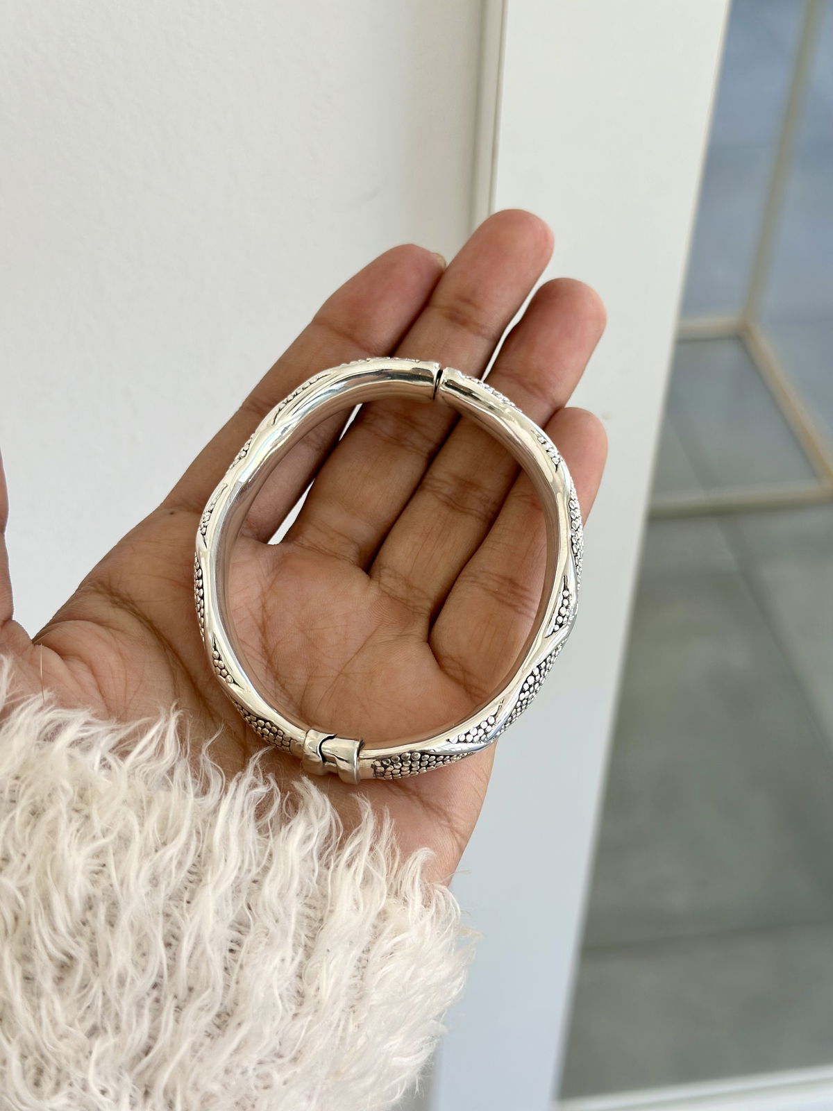 Esclava Plata inflada labrada, ondulada, cierre tipo pinza, 6,5cm de diámetro.