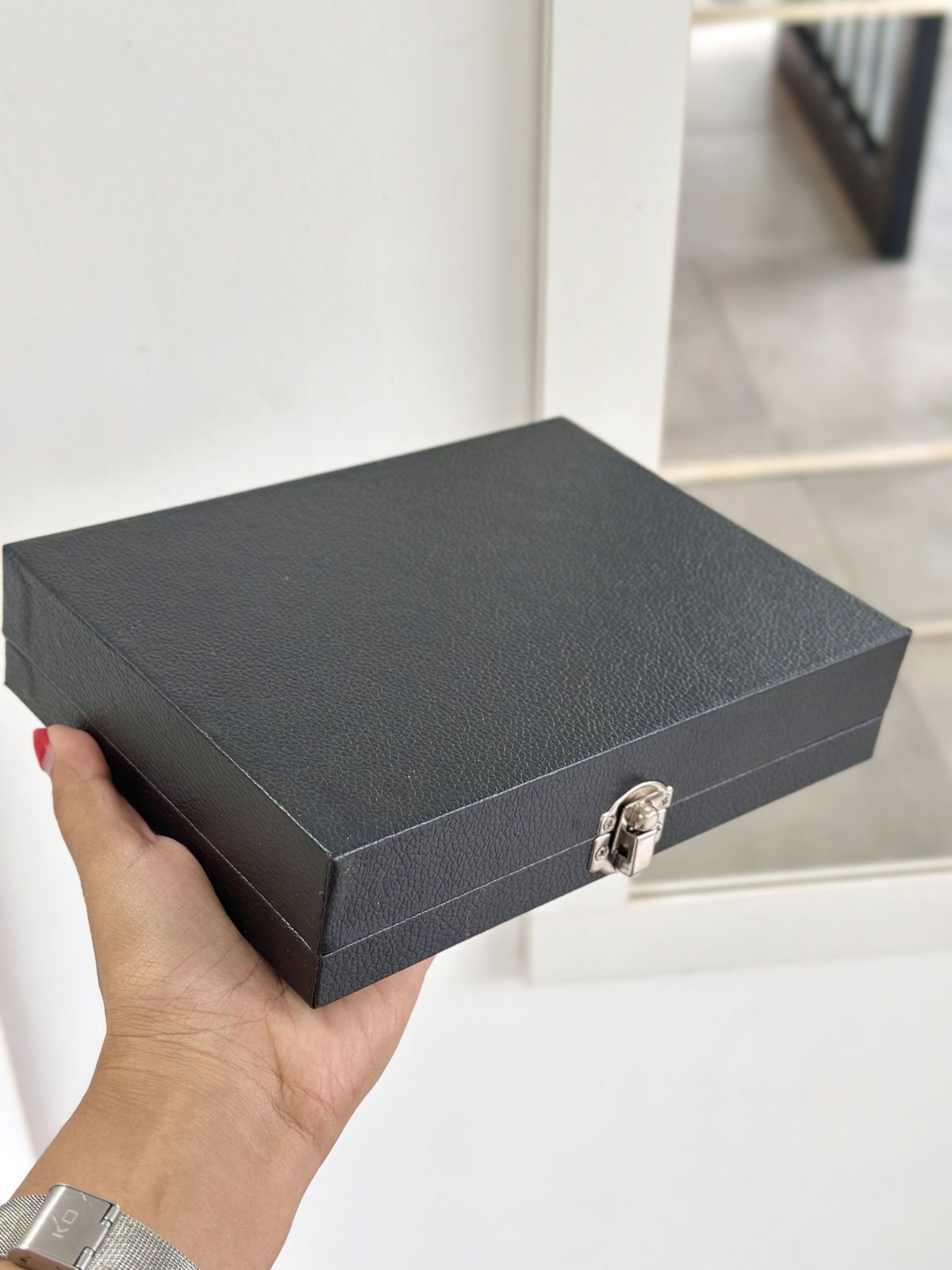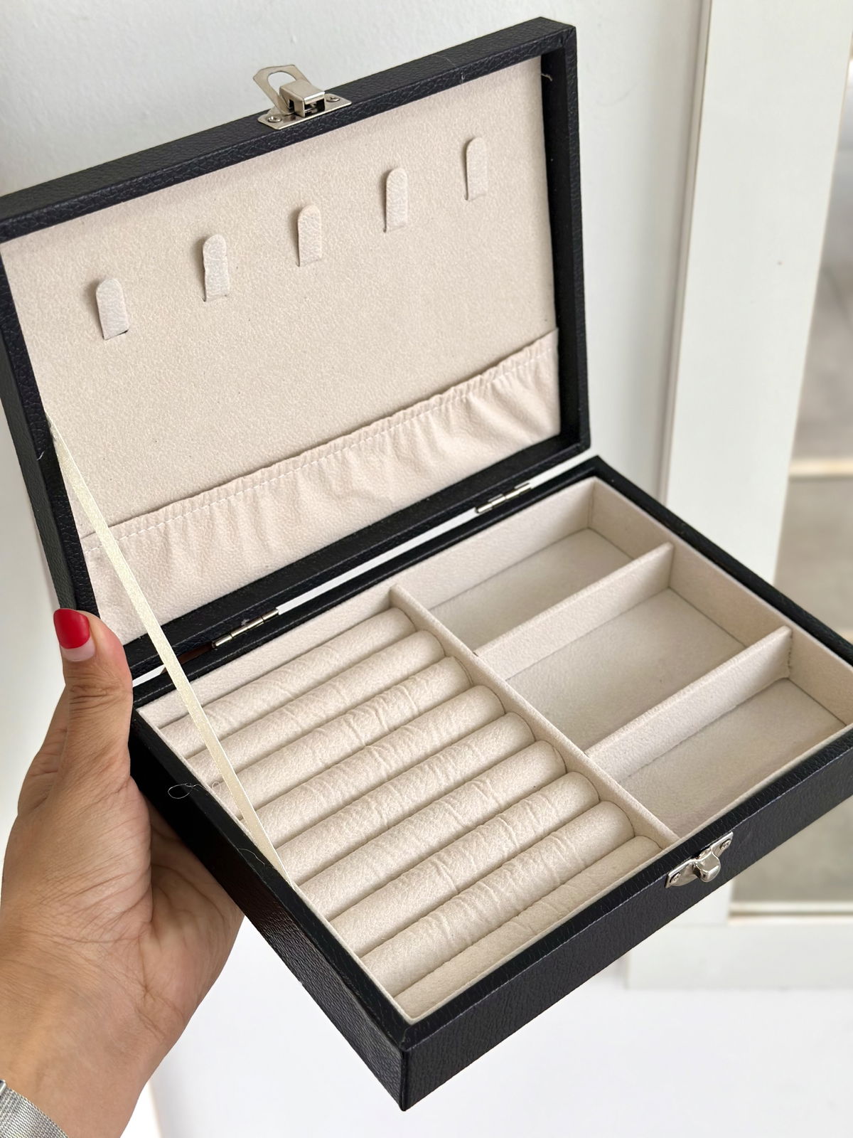 Alhajero forrado en cuerina, interior de pana, espacios para guardar cadenas, pulseras, anillos, relojes.