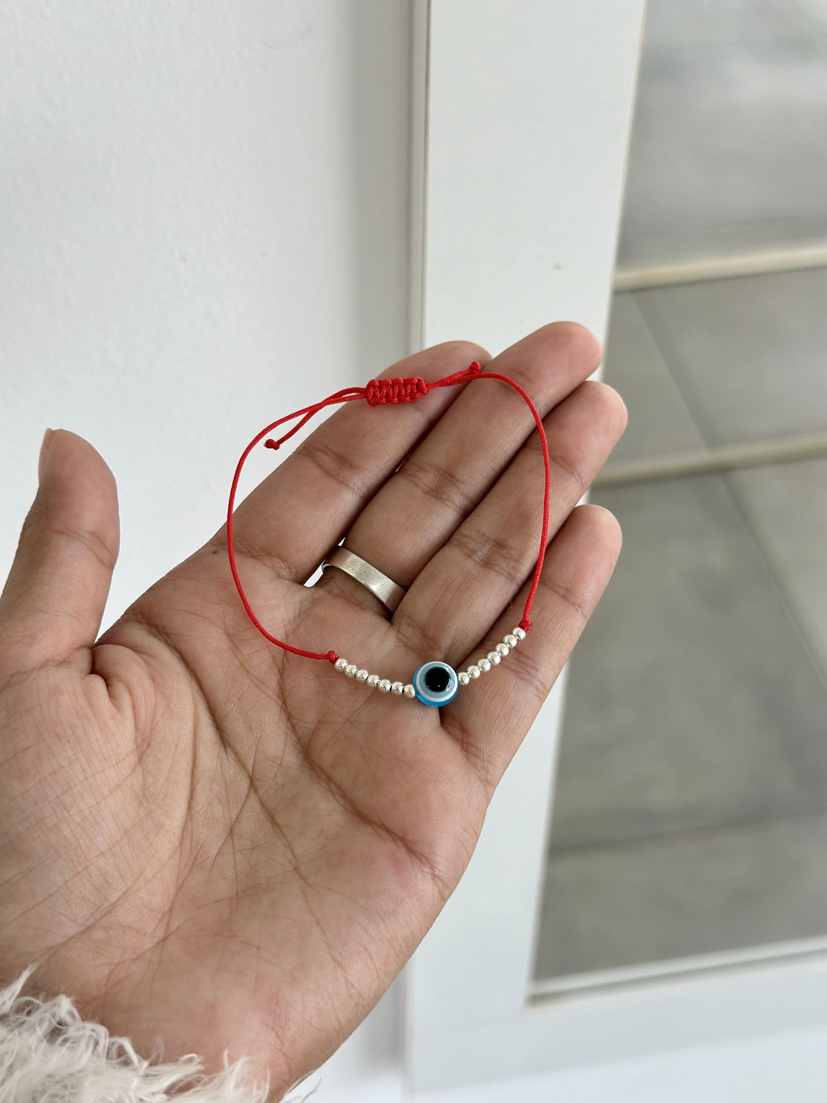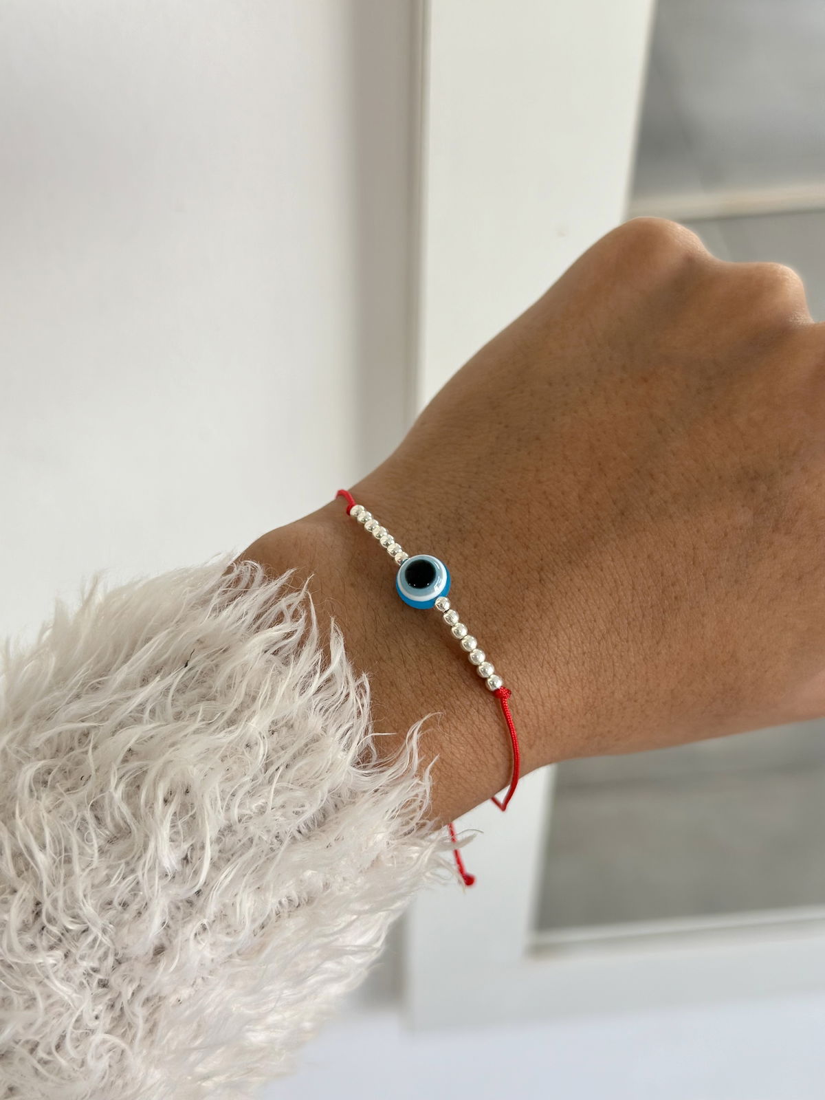 Pulsera hilo ajustable con bolitas y dije ojito plata925.
